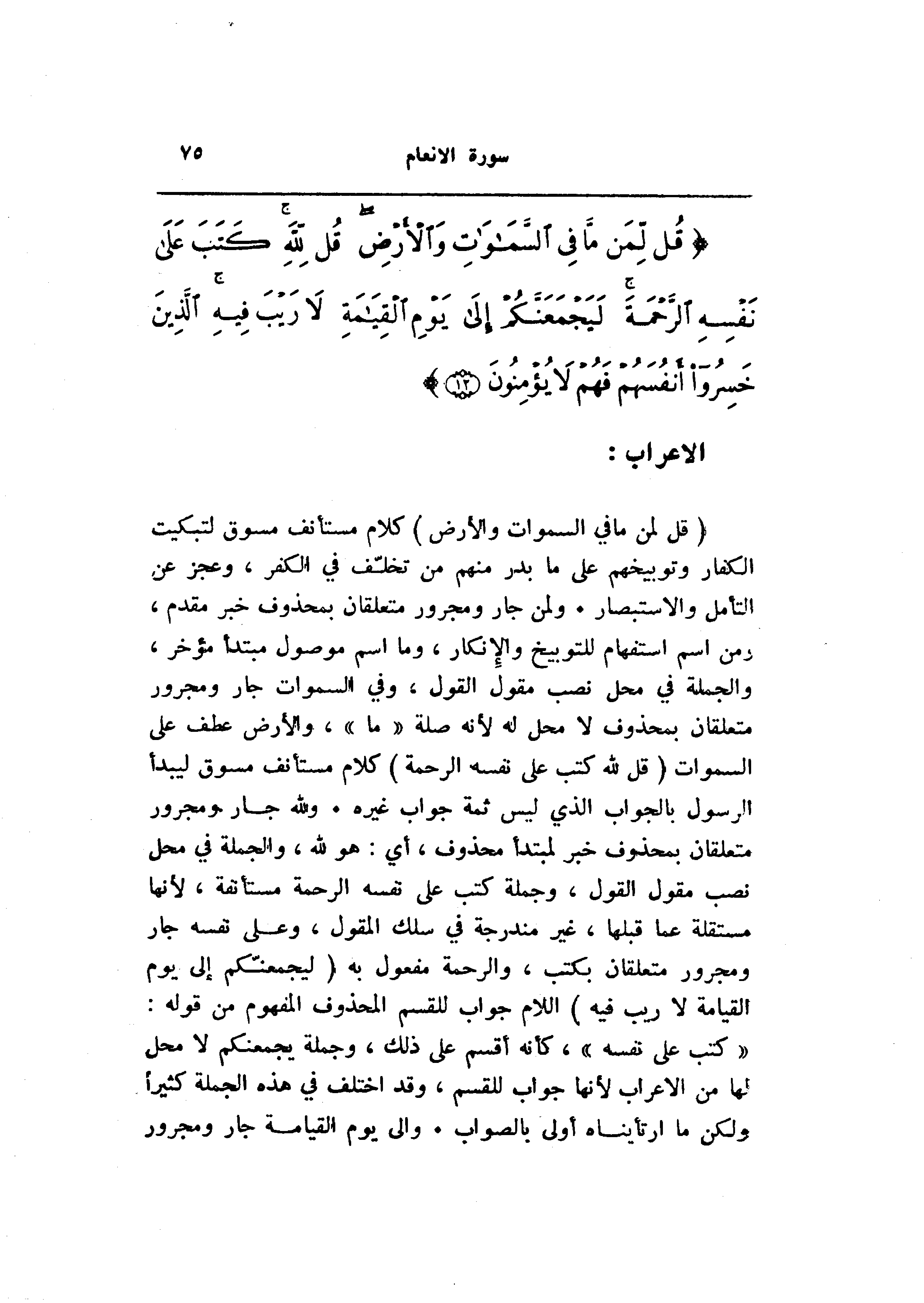 (قُلْ لِمَنْ ما فِي السَّماواتِ وَالْأَرْضِ) كلام مستأنف مسوق لتبكيت الكفار وتوبيخهم على ما بدر منهم من تخلّف في الكفر، وعجز عن التأمل والاستبصار. ولمن جار ومجرور متعلقان بمحذوف خبر مقدم، ومن اسم استفهام للتوبيخ والإنكار، وما اسم موصول مبتدأ مؤخر، والجملة في محل نصب مقول القول، وفي السموات جار ومجرور متعلقان بمحذوف لا محل له لأنه صلة «ما» ، والأرض عطف على السموات (قُلْ لِلَّهِ كَتَبَ عَلى نَفْسِهِ الرَّحْمَةَ) كلام مستأنف مسوق ليبدأ الرسول بالجواب الذي ليس ثمة جواب غيره. ولله جار ومجرور متعلقان بمحذوف خبر لمبتدأ محذوف، أي: هو لله، والجملة في محل نصب مقول القول، وجملة كتب على نفسه الرحمة مستأنفة، لأنها مستقلة عما قبلها، غير مندرجة في سلك المقول، وعلى نفسه جار ومجرور متعلقان بكتب، والرحمة مفعول به (لَيَجْمَعَنَّكُمْ إِلى يَوْمِ الْقِيامَةِ لا رَيْبَ فِيهِ) اللام جواب للقسم المحذوف المفهوم من قوله: