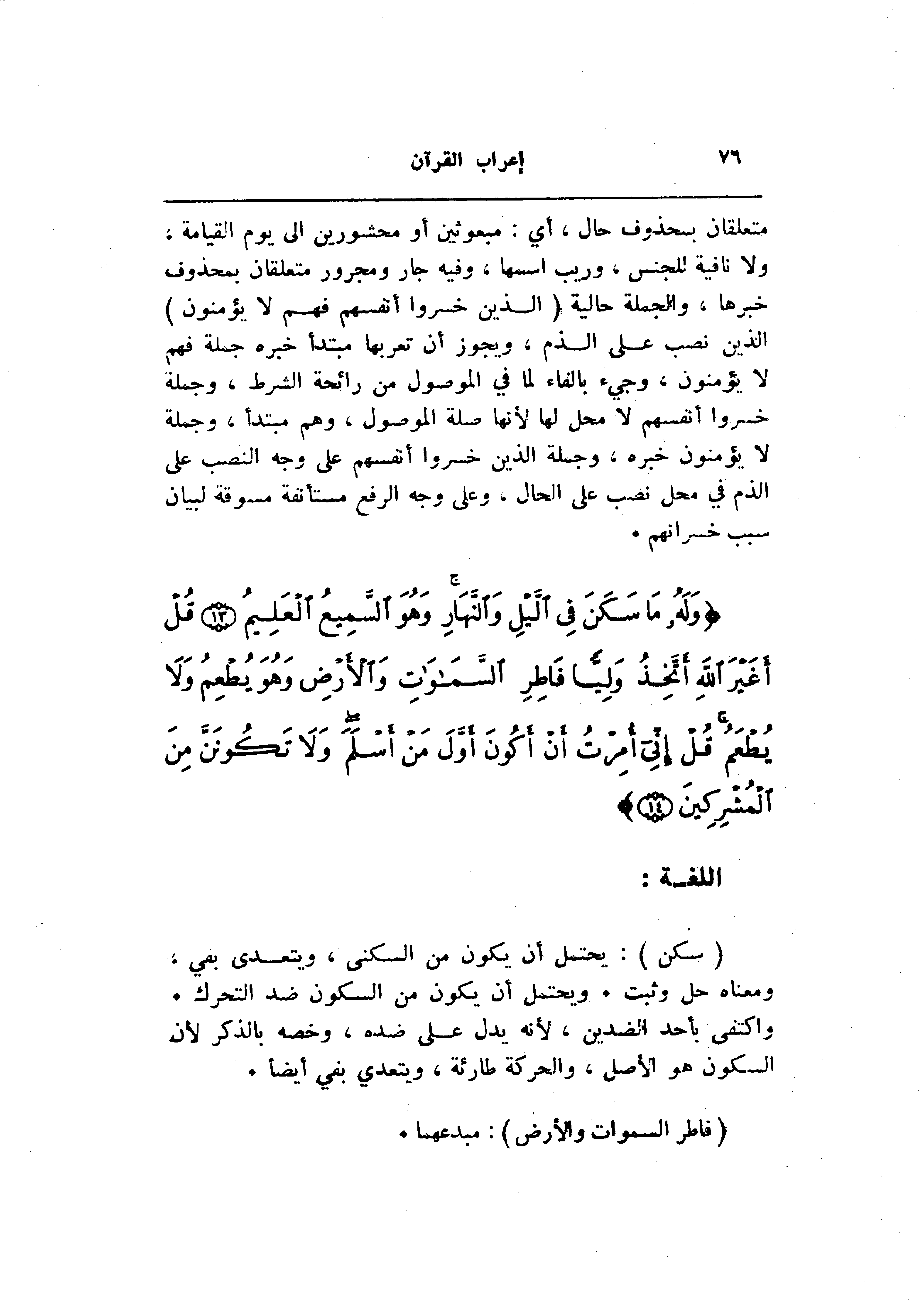 (سَكَنَ) : يحتمل أن يكون من السكنى، ويتعدى بفي، ومعناه حل وثبت. ويحتمل أن يكون من السكون ضد التحرك.