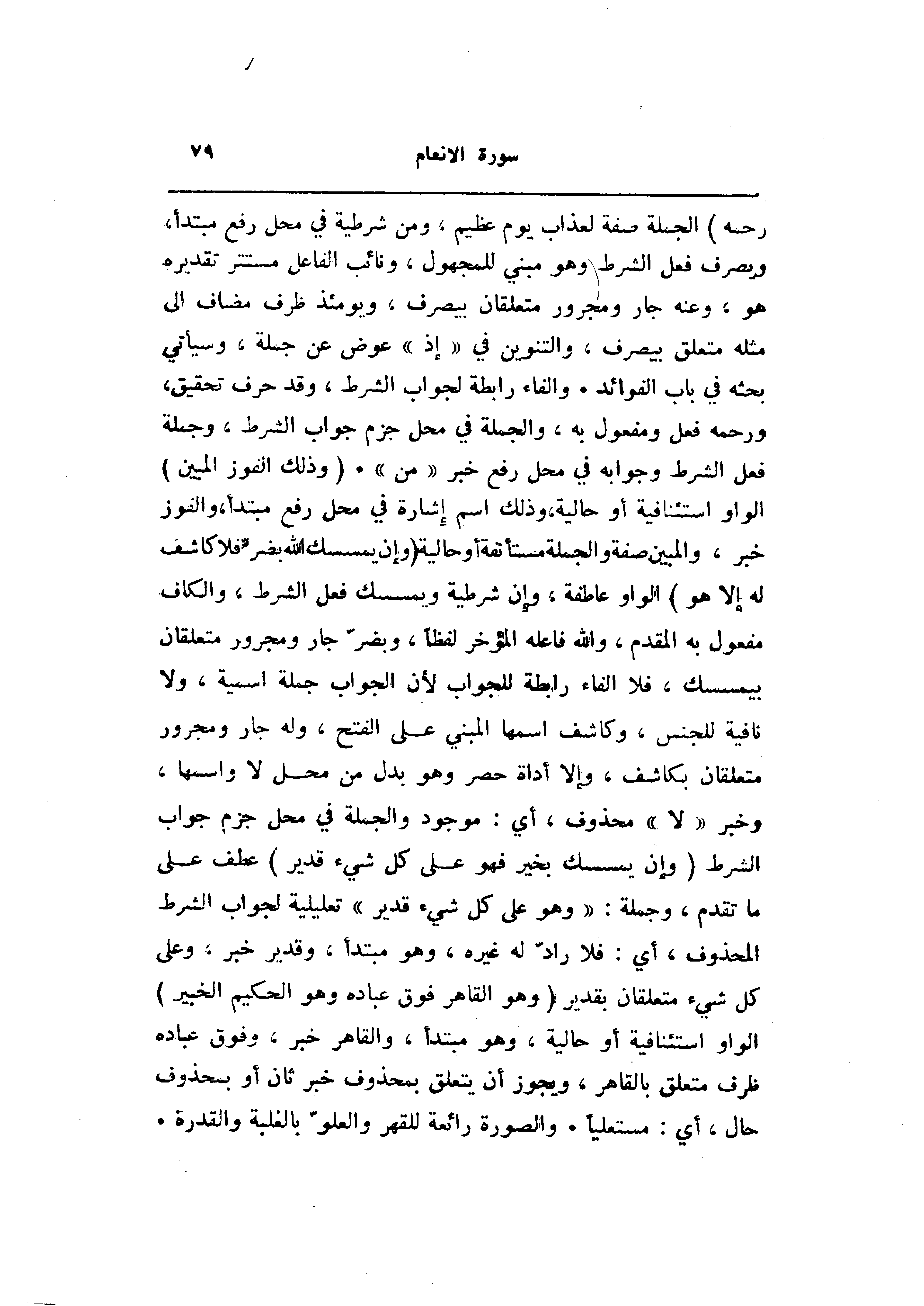 الجملة صفة لعذاب يوم عظيم، ومن شرطية في محل رفع مبتدأ، ويصرف فعل الشرط وهو مبني للمجهول، ونائب الفاعل مستتر تقديره هو، وعنه جار ومجرور متعلقان بيصرف، ويومئذ ظرف مضاف الى مثله متعلق بيصرف، والتنوين في «إذ» عوض عن جملة، وسيأتي بحثه في باب الفوائد. والفاء رابطة لجواب الشرط، وقد حرف تحقيق، ورحمه فعل ومفعول به، والجملة في محل جزم جواب الشرط، وجملة فعل الشرط وجوابه في محل رفع خبر «من» . (وَذلِكَ الْفَوْزُ الْمُبِينُ) الواو استئنافية أو حالية، وذلك اسم إشارة في محل رفع مبتدأ، والفوز خبر، والمبين صفة والجملة مستأنفة أو حالية (وَإِنْ يَمْسَسْكَ اللَّهُ بِضُرٍّ فَلا كاشِفَ لَهُ إِلَّا هُوَ) الواو عاطفة، وإن شرطية ويمسسك فعل الشرط، والكاف مفعول به المقدم، والله فاعله المؤخر لفظا، وبضرّ جار ومجرور متعلقان بيمسسك، فلا الفاء رابطة للجواب لأن الجواب جملة اسمية، ولا نافية للجنس، وكاشف اسمها المبني على الفتح، وله جار ومجرور متعلقان بكاشف، وإلا أداة حصر وهو بدل من محل لا واسمها، وخبر «لا» محذوف، أي: موجود والجملة في محل جزم جواب الشرط (وَإِنْ يَمْسَسْكَ بِخَيْرٍ فَهُوَ عَلى كُلِّ شَيْءٍ قَدِيرٌ) عطف على ما تقدم، وجملة: «وهو على كل شيء قدير» تعليلية لجواب الشرط المحذوف، أي: فلا رادّ له غيره، وهو مبتدأ، وقدير خبر، وعلى كل شيء متعلقان بقدير (وَهُوَ الْقاهِرُ فَوْقَ عِبادِهِ وَهُوَ الْحَكِيمُ الْخَبِيرُ) الواو استئنافية أو حالية، وهو مبتدأ، والقاهر خبر، وفوق عباده ظرف متعلق بالقاهر، ويجوز أن يتعلق بمحذوف خبر ثان أو بمحذوف حال، أي: مستعليا. والصورة رائعة للقهر والعلوّ بالغلبة والقدرة.