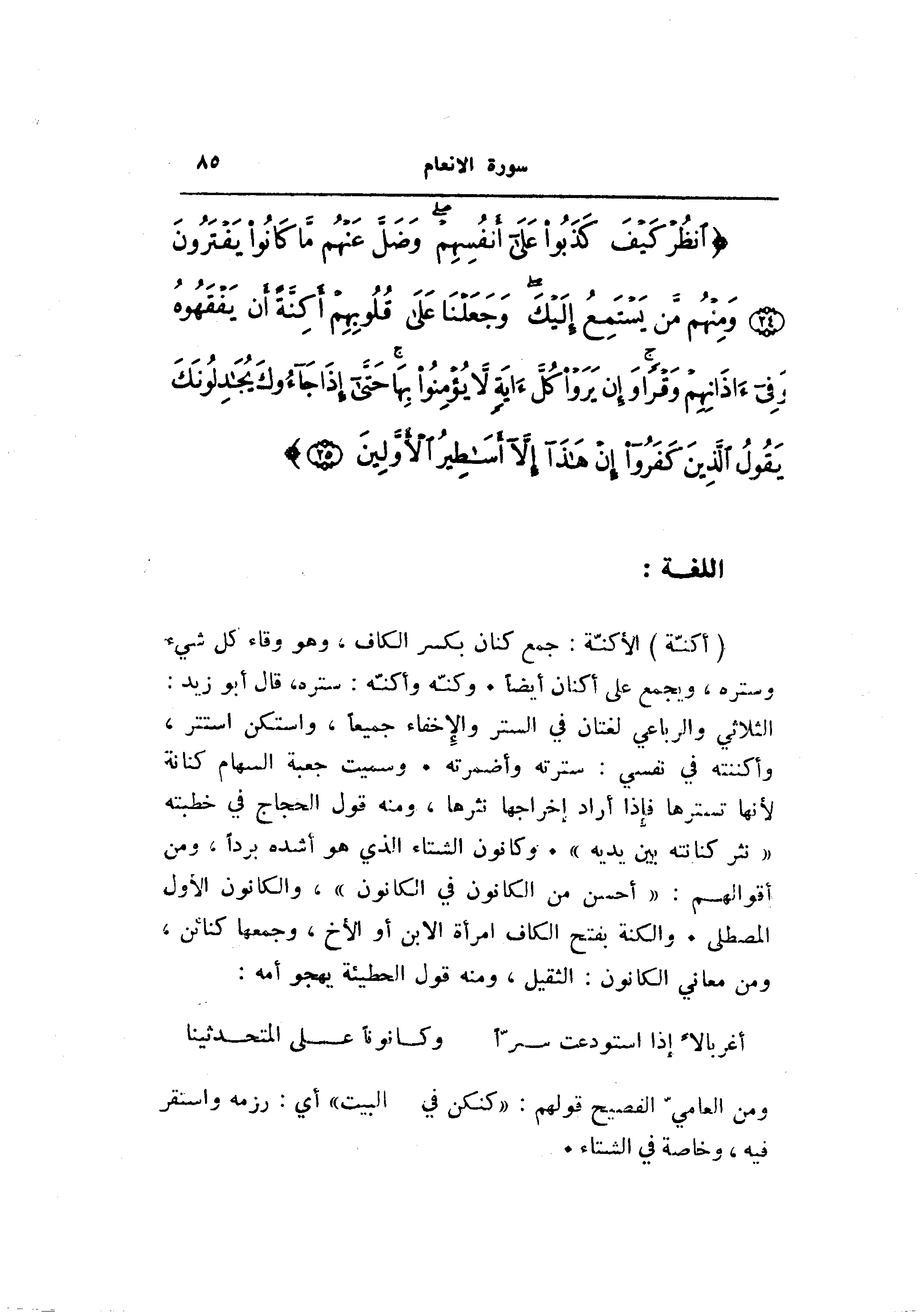 (أَكِنَّةً) الأكنّة: جمع كنان بكسر الكاف، وهو وقاء كل شيء وستره، ويجمع على أكنان أيضا. وكنّه وأكنّه: ستره، قال أبو زيد: