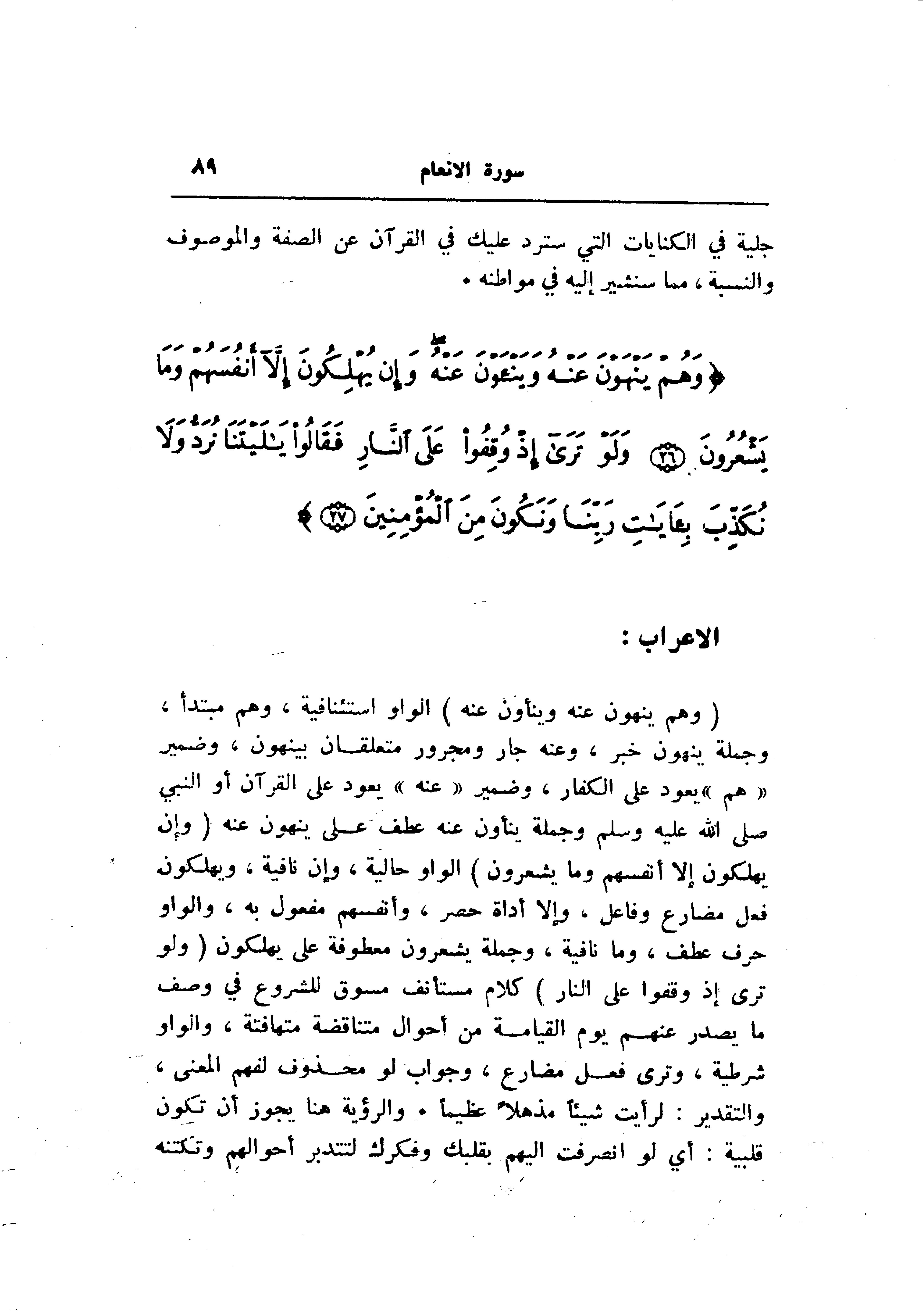 (وَهُمْ يَنْهَوْنَ عَنْهُ وَيَنْأَوْنَ عَنْهُ) الواو استئنافية، وهم مبتدأ، وجملة ينهون خبر، وعنه جار ومجرور متعلقان بينهون، وضمير «هم» يعود على الكفار، وضمير «عنه» يعود على القرآن أو النبي صلى الله عليه وسلم وجملة ينأون عنه عطف على ينهون عنه (وَإِنْ يُهْلِكُونَ إِلَّا أَنْفُسَهُمْ وَما يَشْعُرُونَ) الواو حالية، وإن نافية، ويهلكون فعل مضارع وفاعل، وإلا أداة حصر، وأنفسهم مفعول به، والواو حرف عطف، وما نافية، وجملة يشعرون معطوفة على يهلكون (وَلَوْ تَرى إِذْ وُقِفُوا عَلَى النَّارِ) كلام مستأنف مسوق للشروع في وصف ما يصدر عنهم يوم القيامة من أحوال متناقضة متهافتة، والواو شرطية، وترى فعل مضارع، وجواب لو محذوف لفهم المعنى، والتقدير: لرأيت شيئا مذهلًا عظيما. والرؤية هنا يجوز أن تكون قلبية: أي لو انصرفت إليهم بقلبك وفكرك لتتدبر أحوالهم وتكتنه