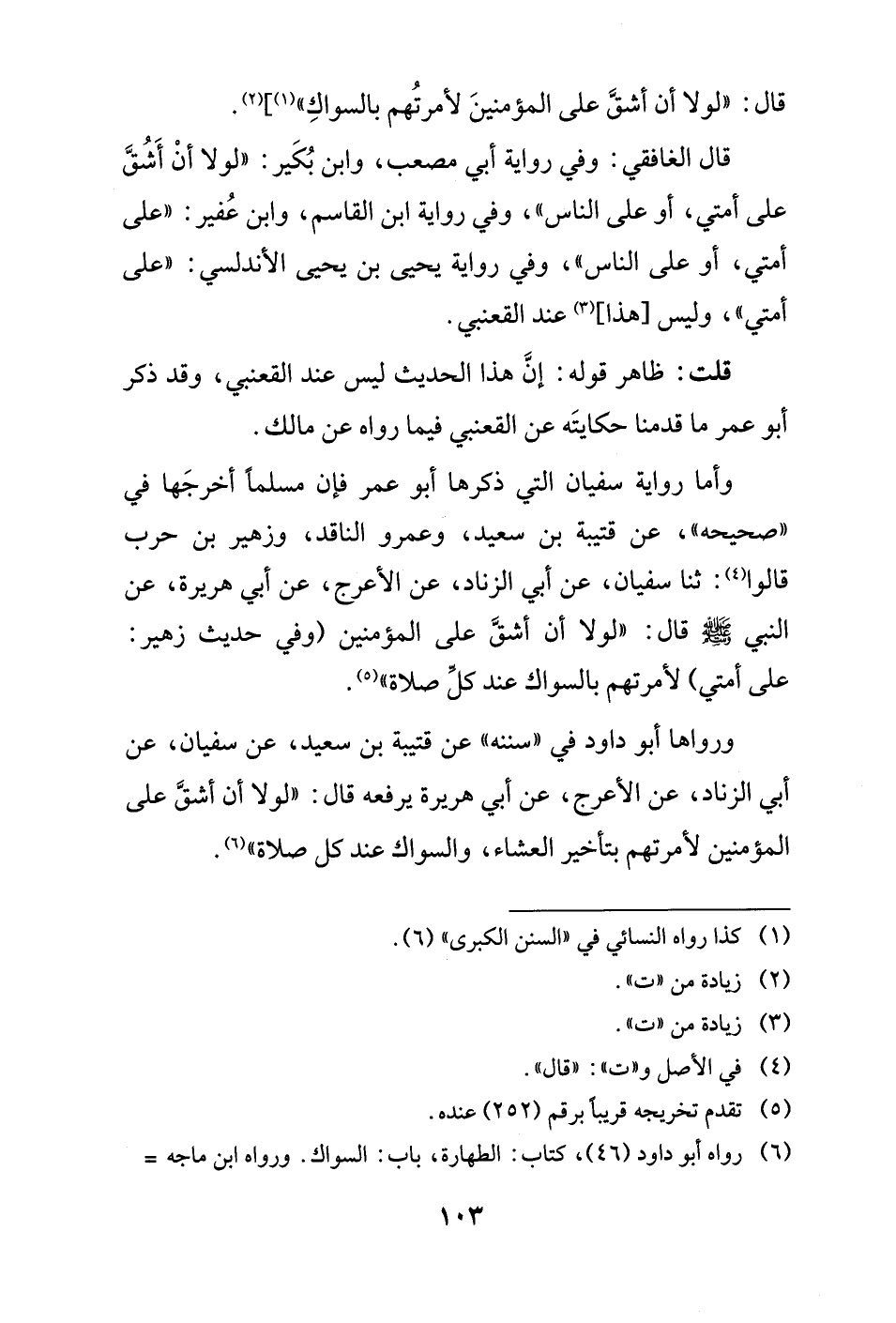 وأما رواية سفيان التي ذكرها أبو عمر فإن مسلماً أخرجَها في "صحيحه"، عن قتيبة بن سعيد، وعمرو الناقد، وزهير بن حرب قالوا (¬4): ثنا سفيان، عن أبي الزناد، عن الأعرج، عن أبي هريرة، عن النبي - صلى الله عليه وسلم - قال: "لولا أن أشقَّ على المؤمنين (وفي حديث زهير: على أمتي) لأمرتهم بالسواك عند كلِّ صلاة" (¬5).