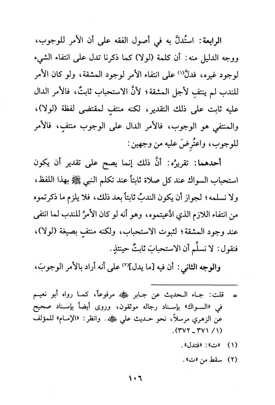 الرابعة: استُدلَّ به في أصول الفقه على أن الأمر للوجوب، ووجه الدليل منه: أن كلمة (لولا) كما ذكرنا تدل على انتفاء الشيء لوجود غيره، فدلَّ (¬1) على انتفاء الأمر لوجود المشقة، ولو كان الأمر للندب لم ينتفِ لأجل المشقة؛ لأنَّ الاستحباب ثابت، فالأمر الدال عليه ثابت على ذلك التقدير، لكنه منتفٍ لمقتضى لفظة (لولا)، والمنتفي هو الوجوب، فالأمر الدال على الوجوب منتفٍ، فالأمر للوجوب، واعتُرِضَ عليه من وجهين: