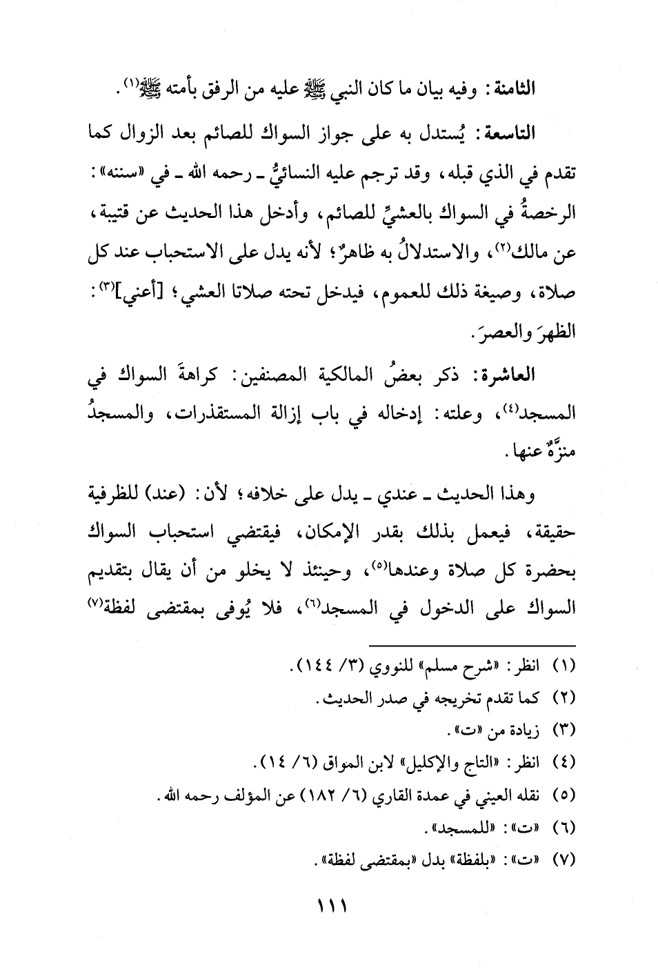 وهذا الحديث - عندي - يدل على خلافه؛ لأنَّ: (عند) للظرفية حقيقة، فيعمل بذلك بقدر الإمكان، فيقتضي استحباب السواك بحضرة كل صلاة وعندها (¬5)، وحينئذ لا يخلو من أن يقال بتقديم السواك على الدخول في المسجد (¬6)، فلا يُوفى بمقتضى لفظة (¬7)