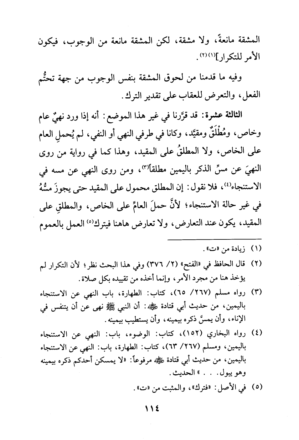 الثالثة عشرة: قد قرَّرنا في غير هذا الموضع: أنه إذا ورد نهيٌ عام وخاص، ومُطْلَقٌ ومقيَّدٌ، وكانا في طرفي النَّهي أو النفي، لم يُحملِ العام على الخاص، ولا المطلقُ على المقيد، وهذا كما في رواية من روى النهيَ عن مسِّ الذكر باليمين مطلقًا (¬3)، ومن روى النَّهي عن مسه في الاستنجاء (¬4)، فلا نقول: إن المطلق محمول على المقيد حتَّى يجوزَ مسُّهُ في غير حالة الاستنجاء؛ لأنَّ حملَ العامِّ على الخاص، والمطلقِ على المقيد، يكون عند التعارض، ولا تعارض هاهنا فيترك (¬5) العمل بالعموم