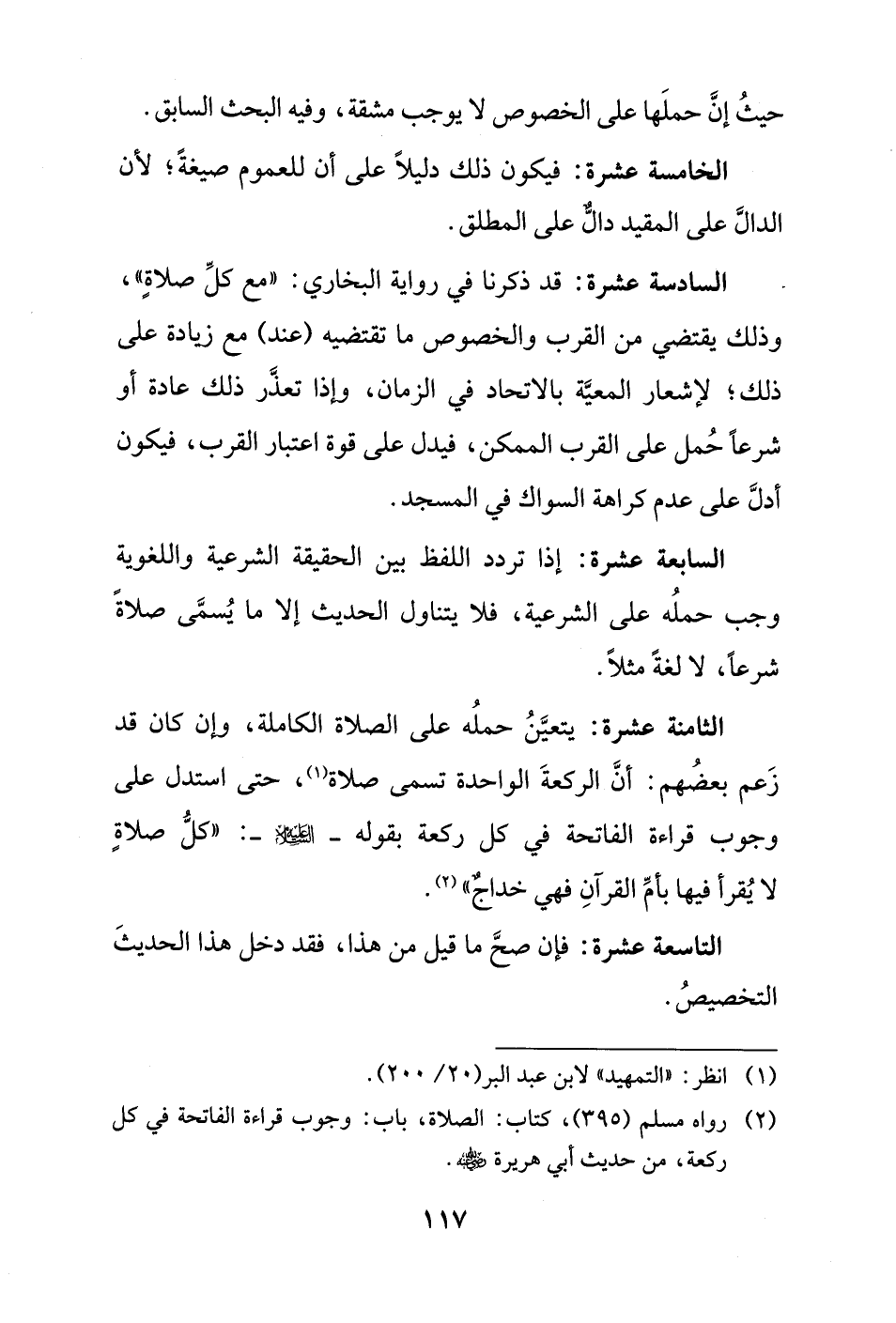 السابعة عشرة: إذا تردد اللفظ بين الحقيقة الشرعية واللغوية وجب حملُه على الشرعية، فلا يتناول الحديث إلَّا ما يُسمَّى صلاةً شرعًا، لا لغةً مثلًا.