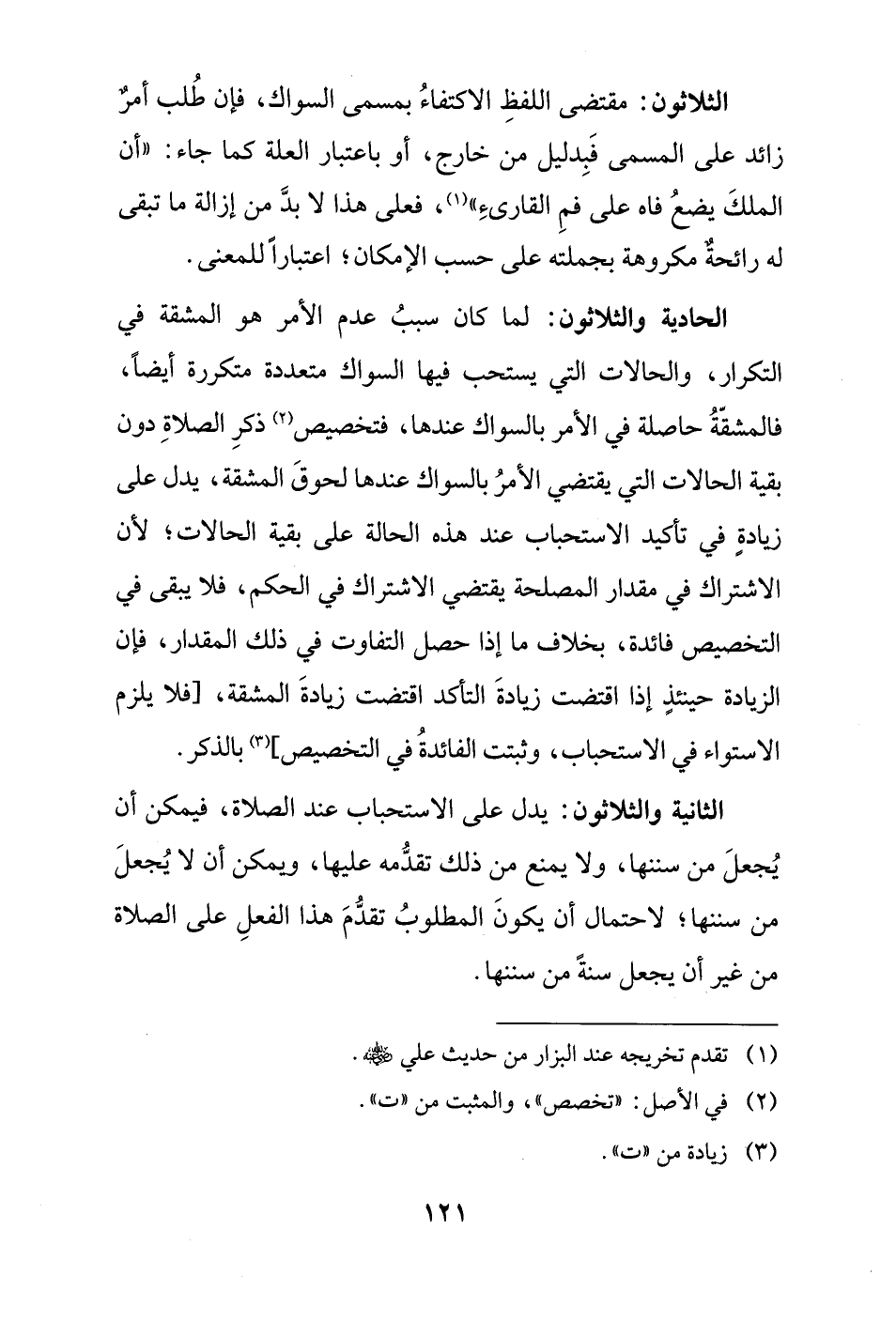 الحادية والثلاثون: لما كان سببُ عدم الأمر هو المشقة في التكرار، والحالات التي يستحب فيها السواك متعددة متكررة أيضًا، فالمشقّةُ حاصلة في الأمر بالسواك عندها، فتخصيص (¬2) ذكرِ الصلاةِ دون بقية الحالات التي يقتضي الأمرُ بالسواك عندها لحوقَ المشقة، يدل على زيادةٍ في تأكيد الاستحباب عند هذه الحالة على بقية الحالات؛ لأنَّ الاشتراك في مقدار المصلحة يقتضي الاشتراك في الحكم، فلا يبقى في التخصيص فائدة، بخلاف ما إذا حصل التفاوت في ذلك المقدار، فإن الزيادة حينئذٍ إذا اقتضت زيادةَ التأكد اقتضت زيادةَ المشقة، [فلا يلزم الاستواء في الاستحباب، وثبتت الفائدةُ في التخصيص] (¬3) بالذكر.