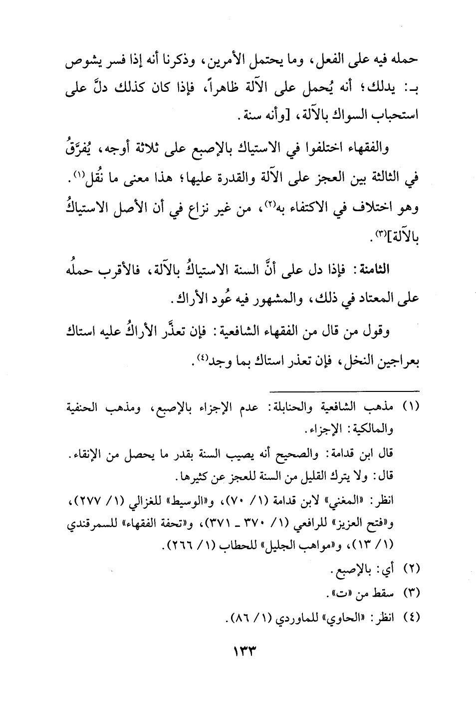 والفقهاء اختلفوا في الاستياك بالإصبع على ثلاثة أوجه، يُفرَّقُ في الثالثة بين العجز على الآلة والقدرة عليها؛ هذا معنى ما نُقل (¬1). وهو اختلاف في الاكتفاء به (¬2)، من غير نزاع في أن الأصل الاستياكُ بالآلة] (¬3).
