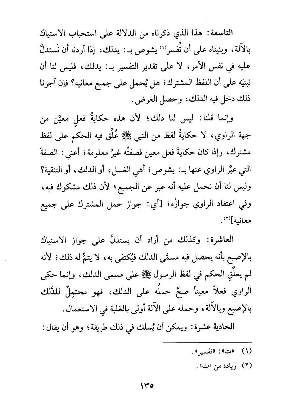 التاسعة: هذا الذي ذكرناه من الدلالة على استحباب الاستياك بالآلة، وبنيناه على أن تُفسر (¬1) يشوص بـ: يدلك، إذا أردنا أن نَستدلَّ عليه في نفس الأمر، لا على تقدير التفسير بـ: يدلك، فليس لنا أن نبنيَه على أن اللفظ المشترك؛ هل يُحمل على جميع معانيه؛ فإن أجزنا ذلك دخل فيه الدلك، وحصل الغرض.