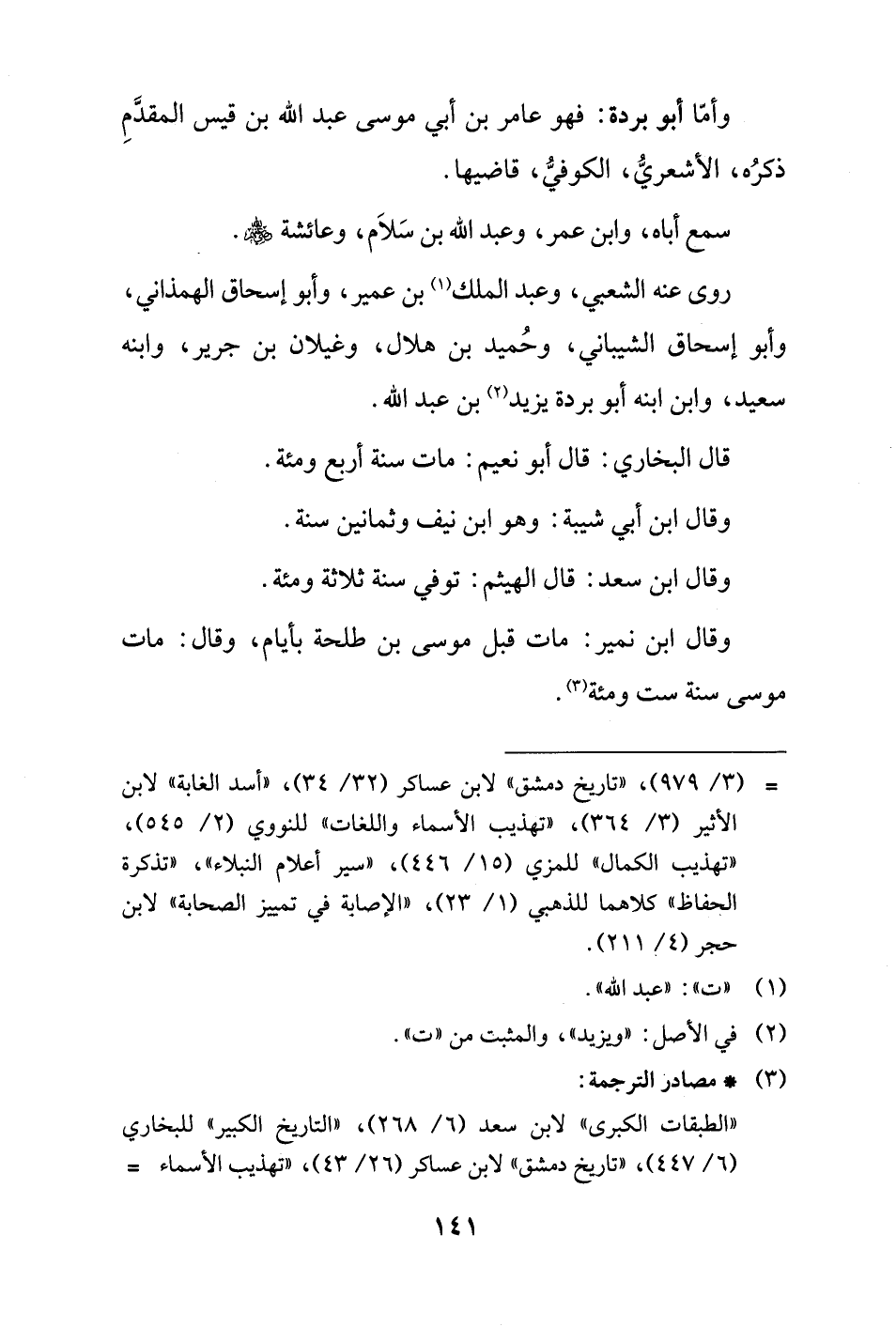وأمّا أبو بردة: فهو عامر بن أبي موسى عبد الله بن قيس المقدَّمِ ذكرُه، الأشعريُّ، الكوفيُّ، قاضيها.