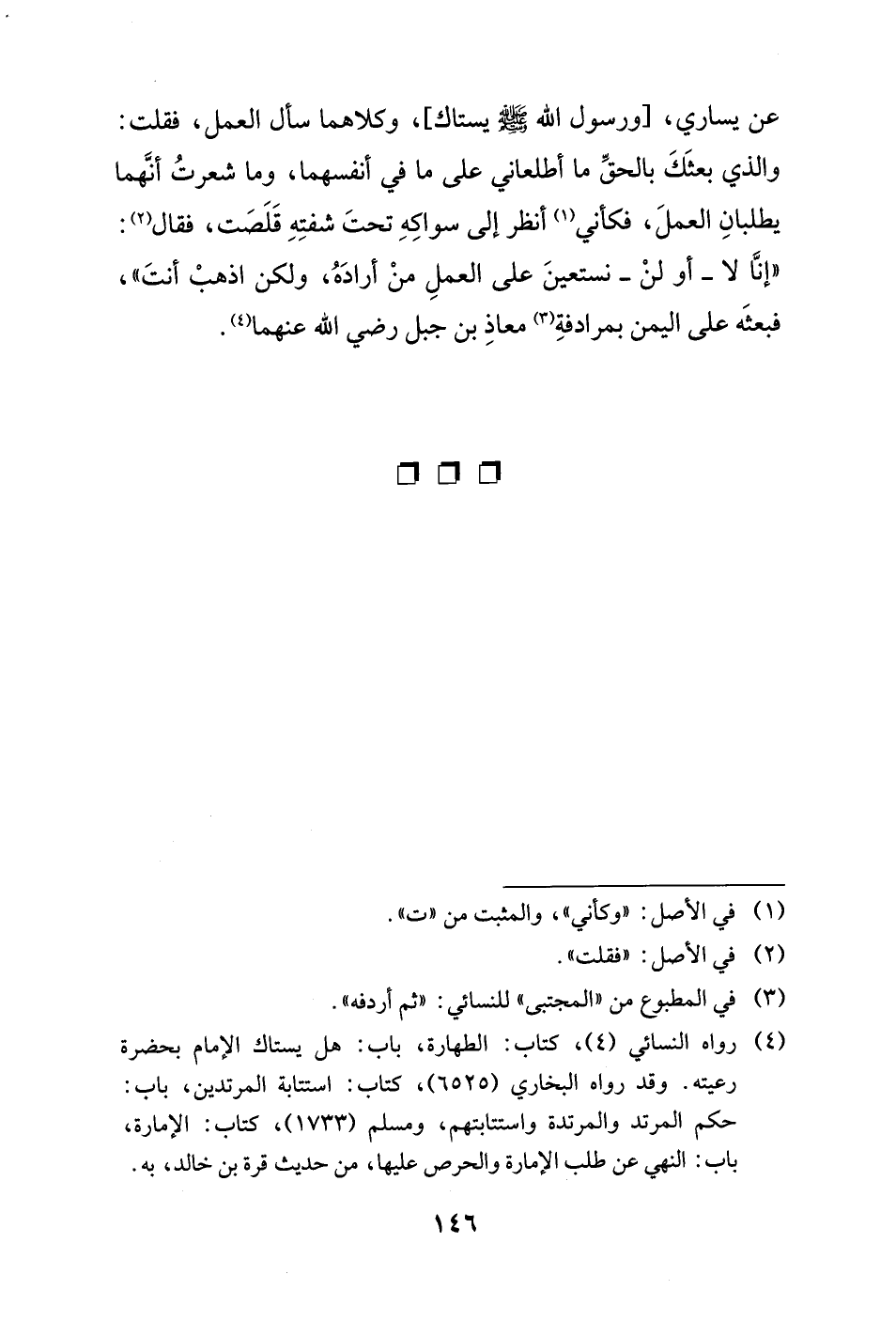 (¬4) رواه النَّسائيّ (4)، كتاب: الطهارة، باب: هل يستاك الإمام بحضرة رعيته. وقد رواه البُخاريّ (6525)، كتاب: استتابة المرتدين، باب: حكم المرتد والمرتدة واستتابتهم، ومسلم (1733)، كتاب: الإمارة، باب: النَّهي عن طلب الإمارة والحرص عليها، من حديث قرة بن خالد، به.