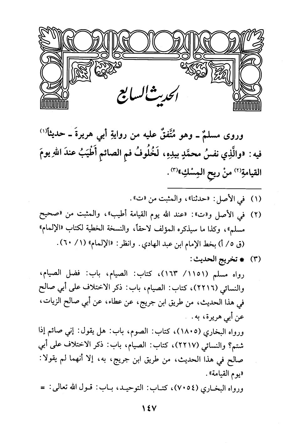 وروى مسلمٌ - وهو مُتَّفق عليه من روايةِ أبي هريرةَ - حديثاً (¬1) فيه: "والَّذِي نفسُ محمَّدٍ بيدِهِ، لَخُلُوفُ فم الصائمِ أَطْيَبُ عندَ اللهِ يومَ القيامةِ (¬2) منْ ريح المِسْكِ" (¬3).