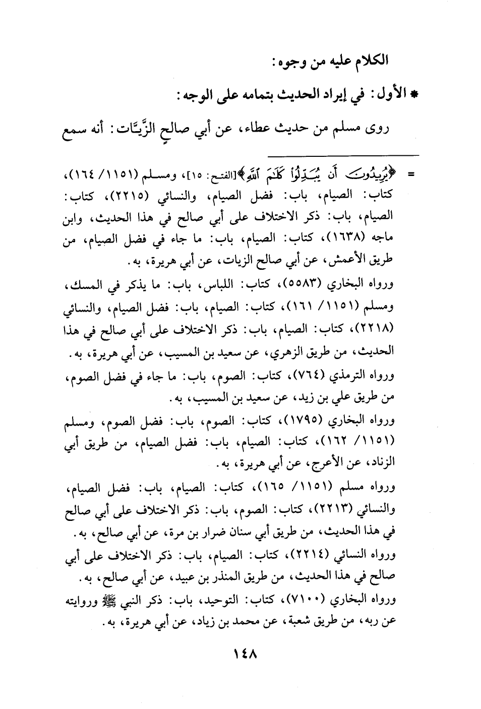 = {يُرِيدُونَ أَنْ يُبَدِّلُوا كَلَامَ اللَّهِ} [الفتح: 15]، ومسلم (1151/ 164)، كتاب: الصيام، باب: فضل الصيام، والنَّسائيُّ (2215)، كتاب: الصيام، باب: ذكر الاختلاف على أبي صالح في هذا الحديث، وابن ماجه (1638)، كتاب: الصيام، باب: ما جاء في فضل الصيام، من طريق الأعمش، عن أبي صالح الزيات، عن أبي هريرة، به.