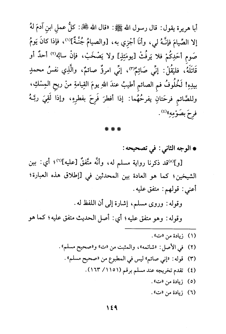 أبا هريرة يقول: قال رسول الله - صلى الله عليه وسلم -: "قال الله - عز وجل -: كلُّ عملِ ابنِ آدمَ لهُ إلَّا الصِّيامَ فإنَّهُ لي، وأنَا أجْزِي به، [والصيامُ جُنَّة] (¬1)، فإذا كانَ يَومُ صَومِ أحَدِكُمْ فلا يَرفُثْ [يومَئِذٍ] ولا يَصْخَبْ، فإن سابَّه (¬2) أحدٌ أو قَاتَلَهُ، فليَقُلْ: إنِّي صَائِمٌ (¬3)، إنِّي امرؤٌ صائمٌ، والَّذِي نفسُ محمدٍ بيدِهِ! لَخُلُوفُ فمِ الصائمِ أطيبُ عندَ اللهِ يومَ القِيامةِ منْ ريحِ المِسْكِ، وللصَّائمِ فرحَتانِ يفرحُهُما: إذا أفطرَ فَرِحَ بفطرِه، وإذا لَقِيَ ربَّهُ فرِخَ بصَوْمِهِ" (¬4).