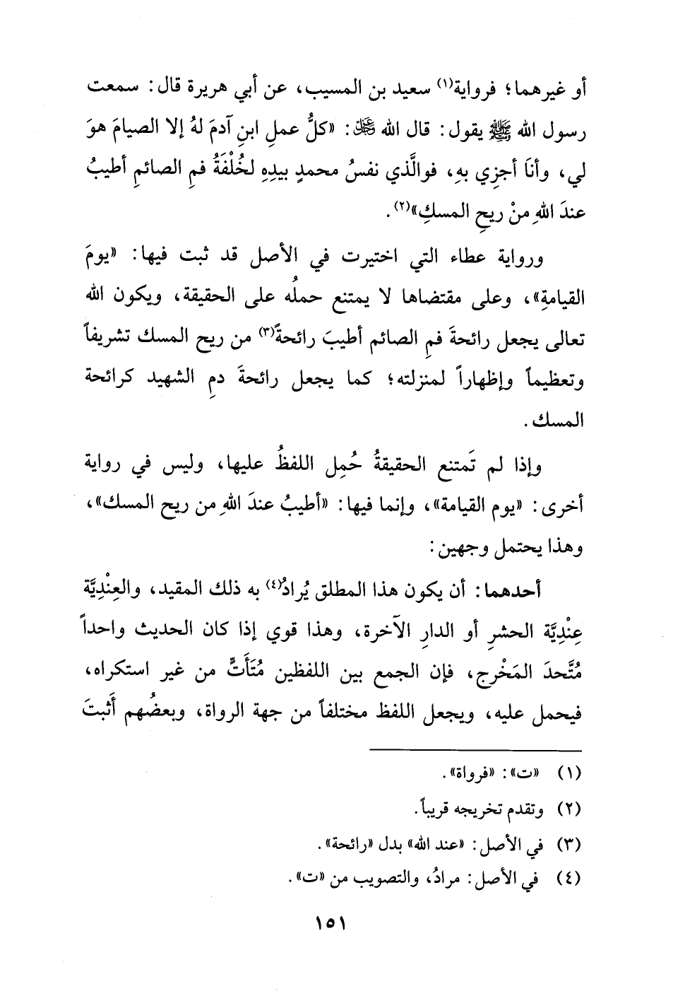 وإذا لم تَمتنع الحقيقةُ حُمِل اللفظُ عليها، وليس في رواية أخرى: "يوم القيامة"، وإنَّما فيها: "أطيبُ عندَ اللهِ من ريح المسك"، وهذا يحتمل وجهين: