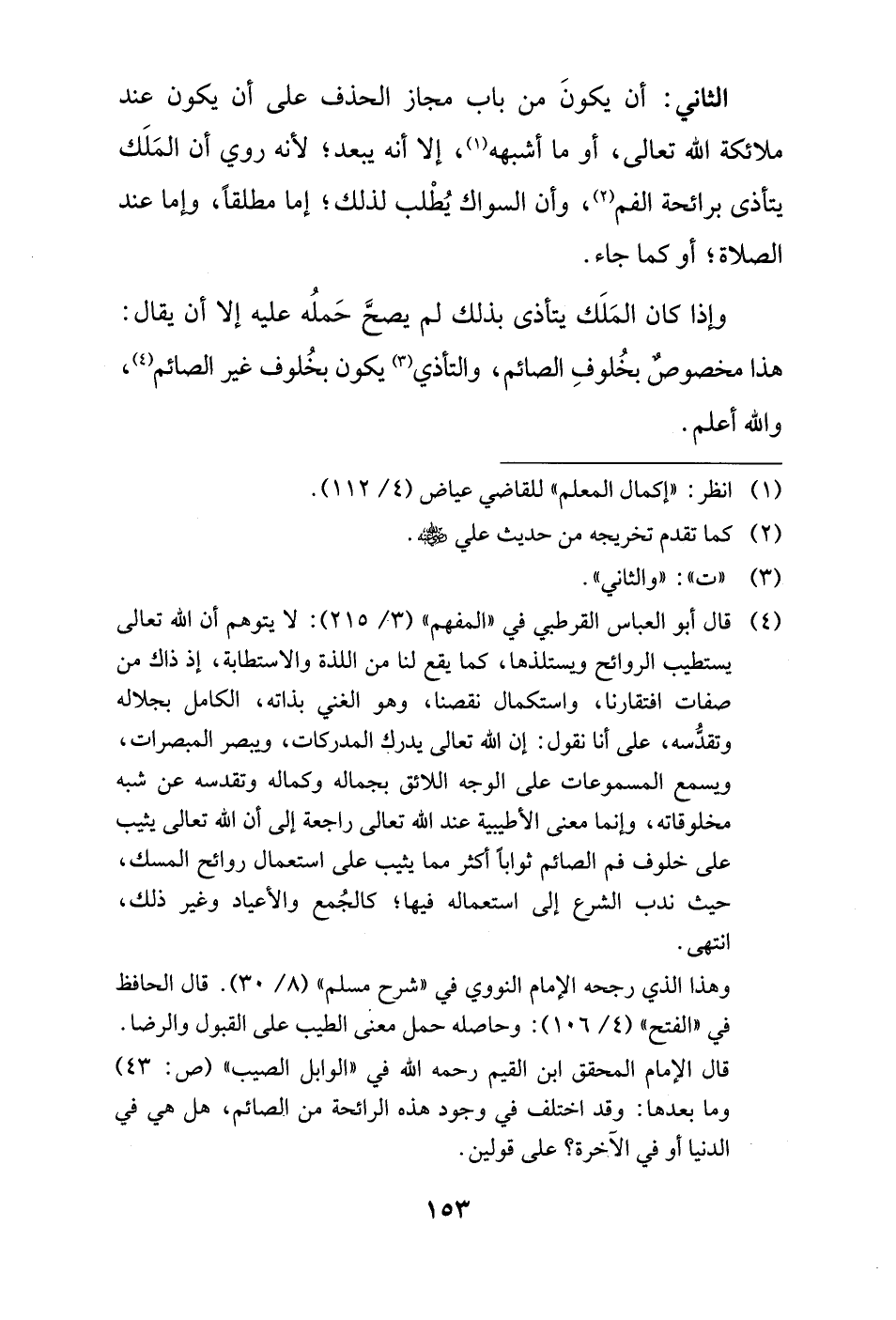 الثَّاني: أن يكونَ من باب مجاز الحذف على أن يكون عند ملائكة الله تعالى، أو ما أشبهه (¬1)، إلَّا أنه يبعد؛ لأنه روي أن المَلَك يتأذى برائحة الفم (¬2)، وأن السواك يُطْلب لذلك؛ إما مطلقًا، وإما عند الصَّلاة؛ أو كما جاء.