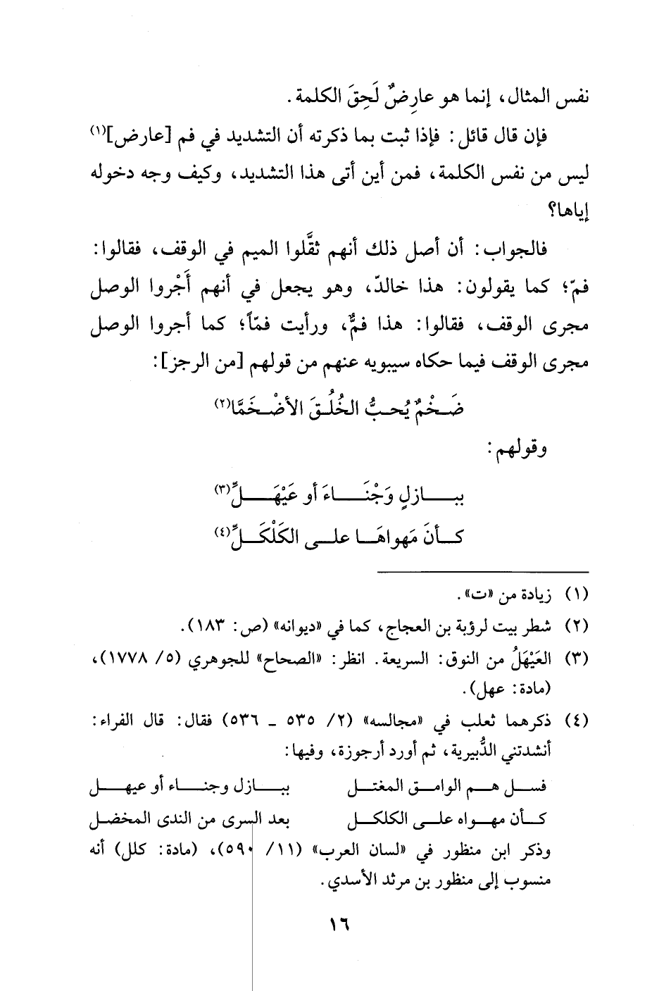 فالجواب: أن أصل ذلك أنهم ثقَّلوا الميم في الوقف، فقالوا: فمّ؛ كما يقولون: هذا خالدّ، وهو يجعل في أنهم أَجْروا الوصل مجرى الوقف، فقالوا: هذا فمٌّ، ورأيت فمًّا؛ كما أجروا الوصل مجرى الوقف فيما حكاه سيبويه عنهم من قولهم [من الرجز]: