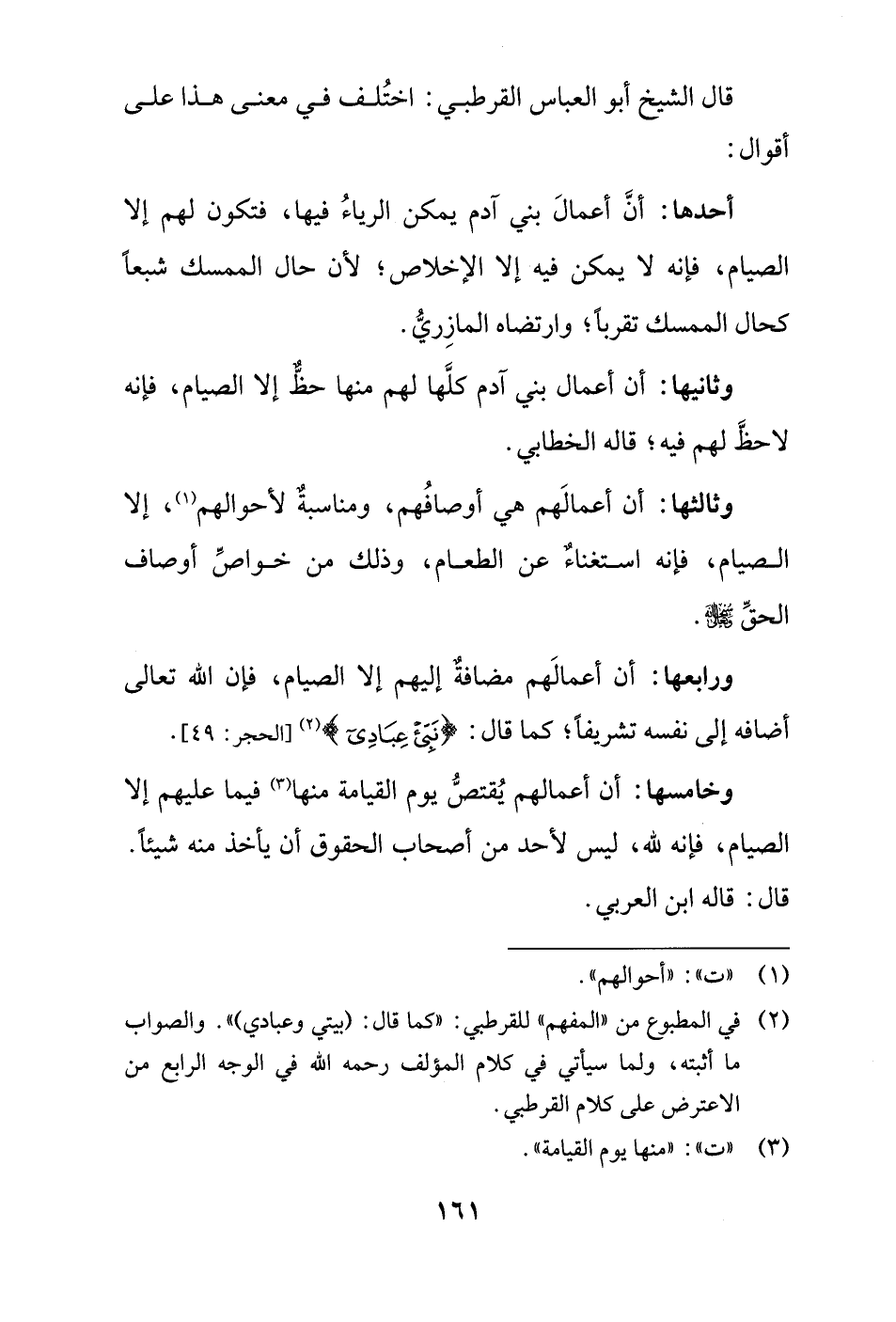 وخامسها: أن أعمالهم يُقتصُّ يوم القيامة منها (¬3) فيما عليهم إلا الصيام، فإنه لله، ليس لأحد من أصحاب الحقوق أن يأخذ منه شيئاً. قال: قاله ابن العربي.