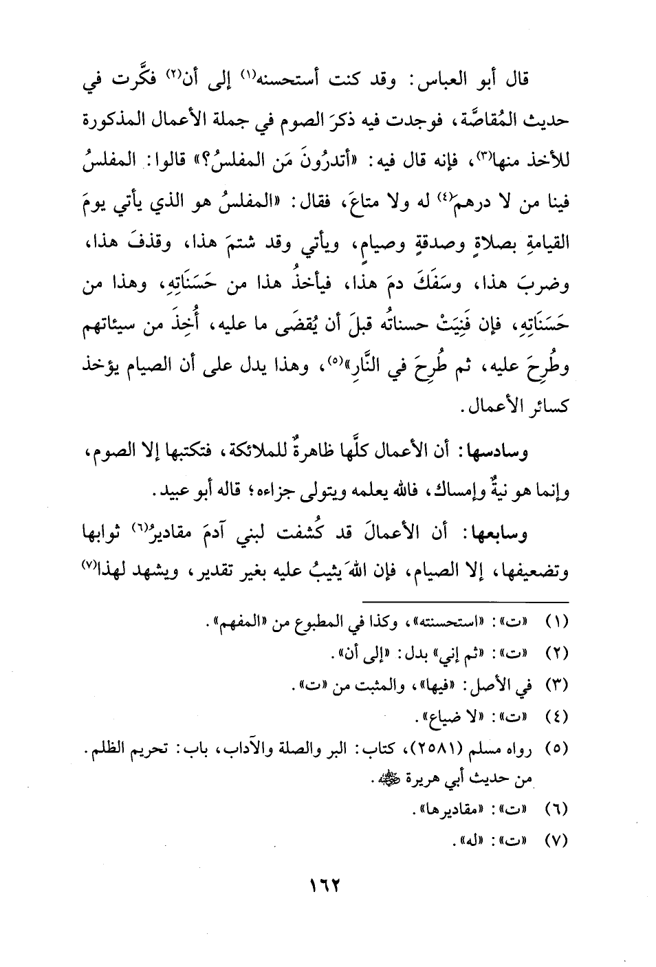 قال أبو العباس: وقد كنت أستحسنه (¬1) إلى أن (¬2) فكَّرت في حديث المُقاصَّة، فوجدت فيه ذكرَ الصوم في جملة الأعمال المذكورة للأخذ منها (¬3)، فإنه قال فيه: "أتدرُونَ مَن المفلسُ؟ " قالوا: المفلسُ فينا من لا درهم (¬4) له ولا متاعَ، فقال: "المفلسُ هو الذي يأتي يومَ القيامةِ بصلاةٍ وصد قةٍ وصيامٍ، ويأتي وقد شتمَ هذا، وقذفَ هذا، وضربَ هذا، وسَفَكَ دمَ هذا، فيأخذُ هذا من حَسَنَاتِهِ، وهذا من حَسَنَاتِهِ، فإن فَنِيَتْ حسناتُه قبلَ أن يُقضَى ما عليه، أُخِذَ من سيئاتهم وطُرِحَ عليه، ثم طُرِحَ في النَّارِ" (¬5)، وهذا يدل على أن الصيام يؤخذ كسائر الأعمال.
