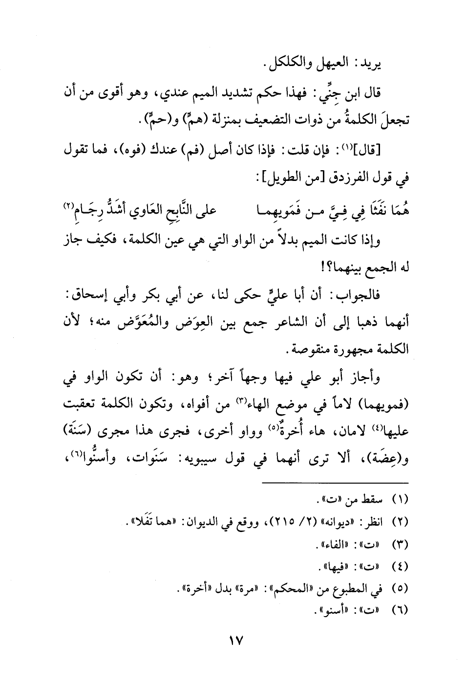 قال ابن جِنِّي: فهذا حكم تشديد الميم عندي، وهو أقوى من أن تجعلَ الكلمةُ من ذوات التضعيف بمنزلة (همٍّ) و (حمٍّ).