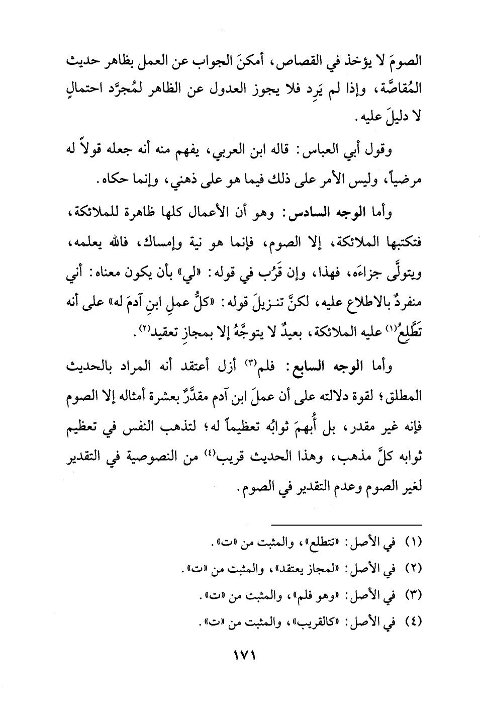 وأما الوجه السابع: فلم (¬3) أزل أعتقد أنه المراد بالحديث المطلق؛ لقوة دلالته على أن عملَ ابن آدم مقدَّرٌ بعشرة أمثاله إلا الصوم فإنه غير مقدر، بل أُبهمَ ثوابُه تعظيماً له؛ لتذهب النفس في تعظيم ثوابه كلَّ مذهب، وهذا الحديث قريب (¬4) من النصوصية في التقدير لغير الصوم وعدم التقدير في الصوم.