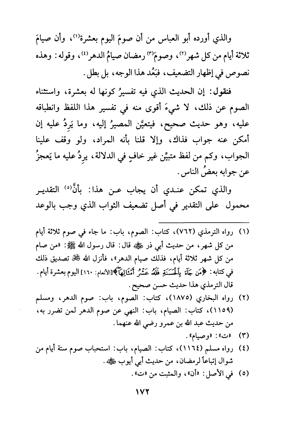 فنقول: إن الحديث الذي فيه تفسيرُ كونها له بعشرة، واستثناء الصوم عن ذلك، لا شيءَ أقوى منه في تفسير هذا اللفظ وانطباقه عليه، وهو حديث صحيح، فيتعيَّن المصيرُ إليه، وما يَرِدُ عليه إن أمكن عنه جواب فذاك، وإلا قلنا بأنه المراد، ولو وقف علينا الجواب، وكم من لفظ متبيِّن غير خافٍ في الدلالة، يرِدُ عليه ما يَعجزُ عن جوابه بعضُ الناس.