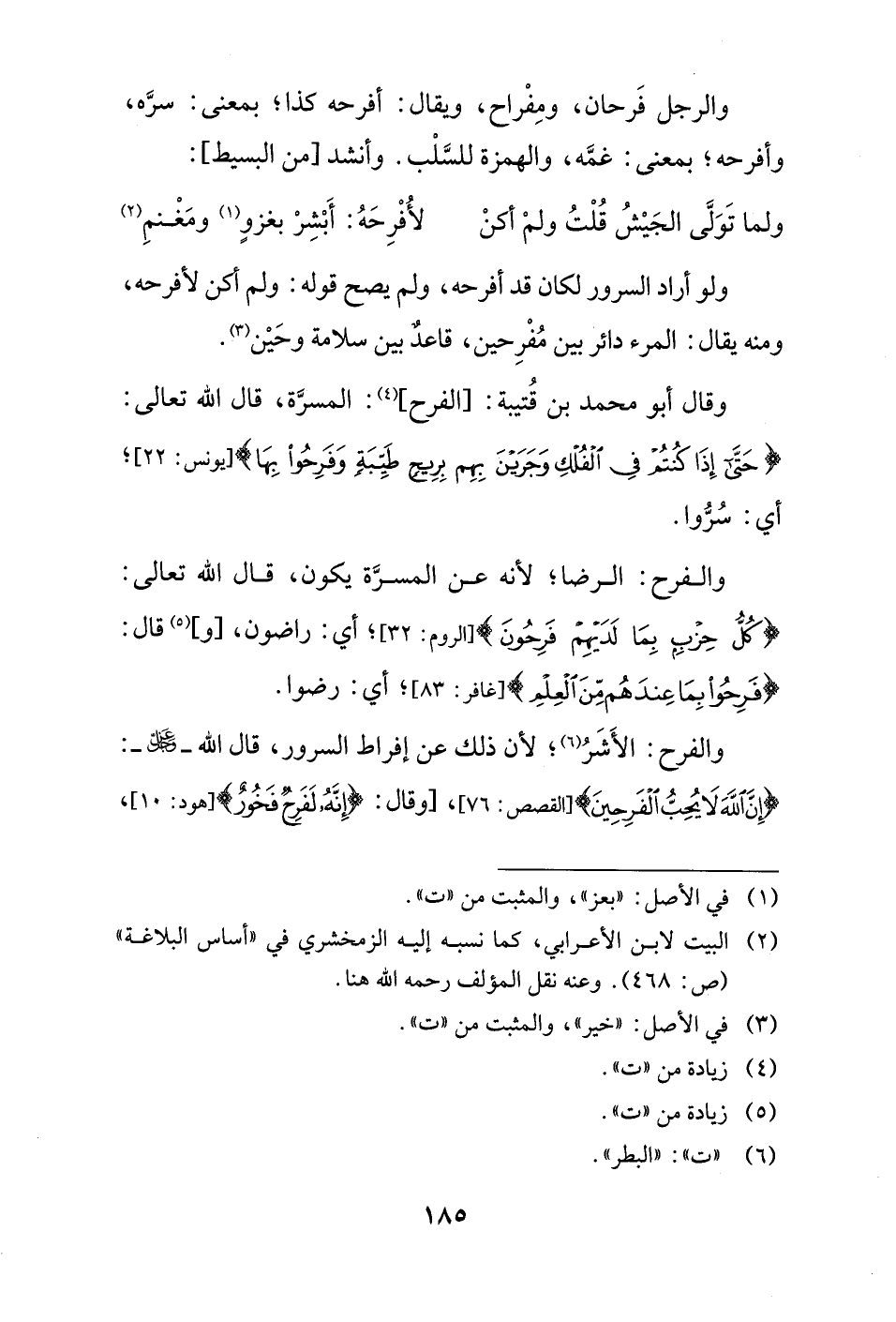 وقال أبو محمد بن قُتيبة: [الفرح] (¬4): المسرَّة، قال الله تعالى: {حَتَّى إِذَا كنُتُمْ فِى الْفُلْكِ وَجَرَيْنَ بِهِم بِرِيحٍ طَيِّبَةٍ وَفَرِحُواْ بِهَا} [يونس: 22]؛ أي: سُرُّوا.