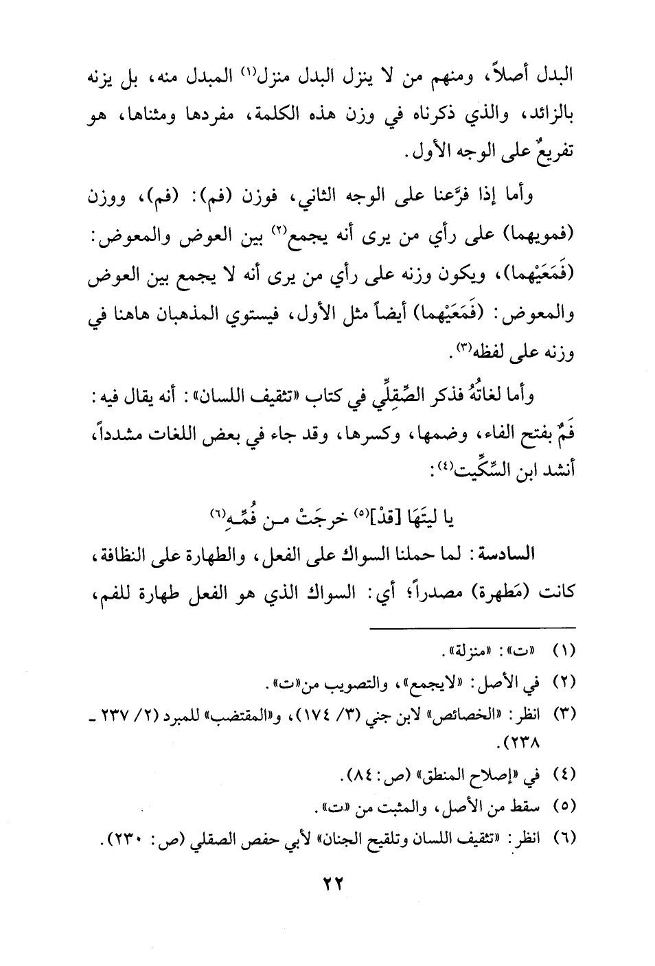 البدل أصلًا، ومنهم من لا ينزل البدل منزل (¬1) المبدل منه، بل يزنه بالزائد، والذي ذكرناه في وزن هذه الكلمة، مفردها ومثناها، هو تفريعٌ على الوجه الأول.