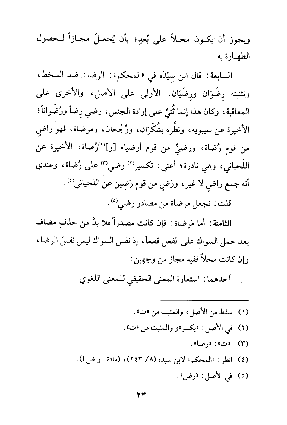السابعة: قال ابن سِيْدَه في "المحكم": الرضا: ضد السخط، وتثنيته رِضَوَان ورِضَيَان، الأولى على الأصل، والأخرى على المعاقبة، وكان هذا إنما ثُنيِّ على إرادة الجنس، رضي رِضًا ورُضْوانًا؛ الأخيرة عن سيبويه، ونظَّره بشُكْرَان، ورُجْحان، ومرضاة، فهو راضٍ من قوم رُضاة، ورضيٌّ من قوم أرضياء [و] (¬1) رُضاة، الأخيرة عن اللّحياني، وهي نادرة؛ أعني: تكسير (¬2) رضي (¬3) على رُضاة، وعندي أنه جمع راضٍ لا غير، ورَضٍ من قوم رَضِين عن اللحياني (¬4).