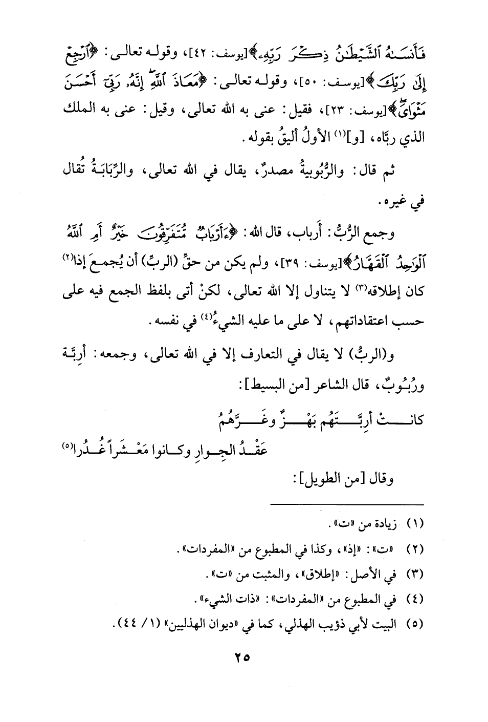 و (الربُّ) لا يقال في التعارف إلا في الله تعالى، وجمعه: أرِبَّة ورُبُوبٌ، قال الشاعر [من البسيط]: