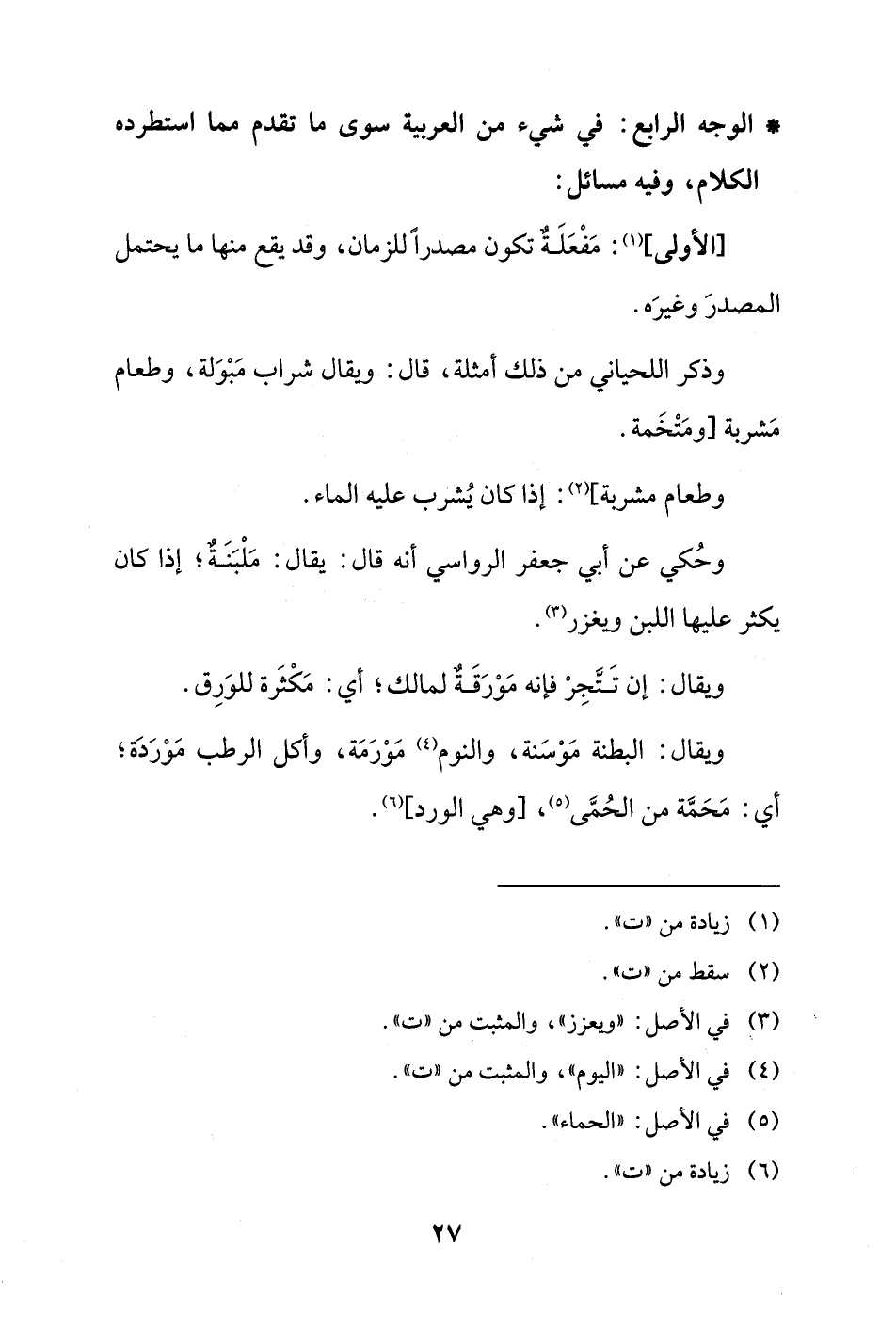 * الوجه الرابع: في شيء من العربية سوى ما تقدم مما استطرده الكلام، وفيه مسائل: