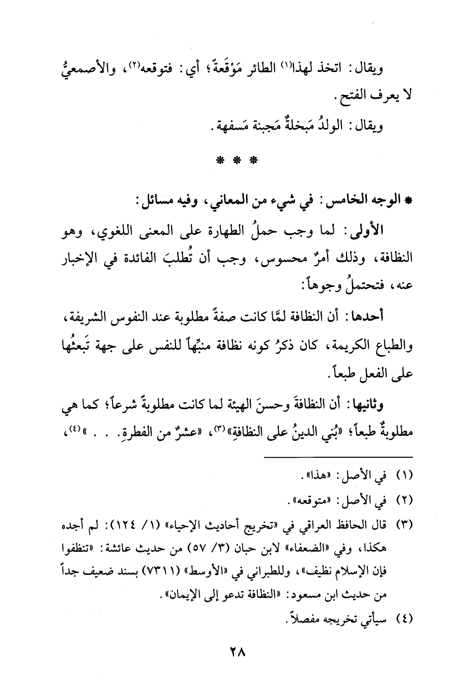 الأولى: لما وجب حملُ الطهارة على المعنى اللغوي، وهو النظافة، وذلك أمر محسوس، وجب أن تُطلبَ الفائدة في الإخبار عنه، فتحتملُ وجوهًا: