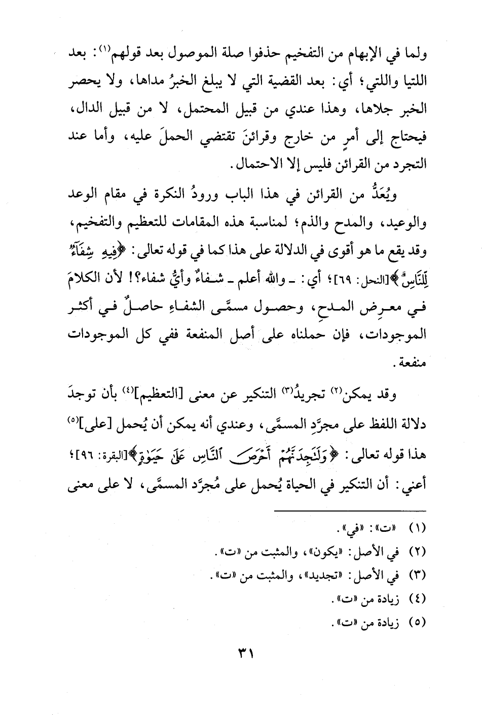 وقد يمكن (¬2) تجريدُ (¬3) التنكير عن معنى [التعظيم] (¬4) بأن توجدَ دلالة اللفظ على مجرَّدِ المسمَّى، وعندي أنه يمكن أن يُحمل [على] (¬5) هذا قوله تعالى: {وَلَتَجِدَنَّهُمْ أَحْرَصَ النَّاسِ عَلَى حَيَاةٍ} [البقرة: 96] أعني: أن التنكير في الحياة يُحمل على مُجرَّد المسمَّى، لا على معنى