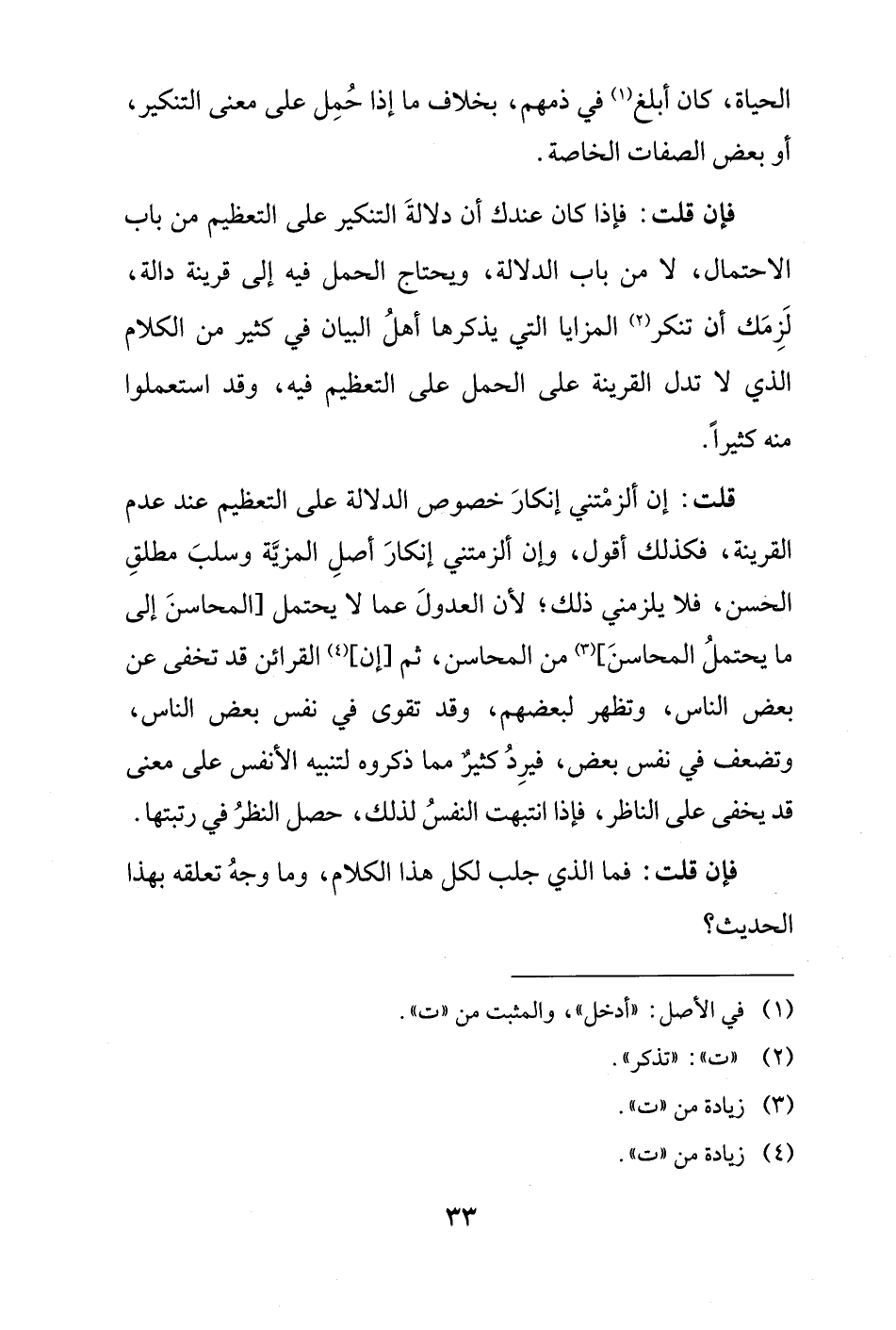 قلت: إن ألزمْتني إنكارَ خصوص الدلالة على التعظيم عند عدم القرينة، فكذلك أقول، وإن ألزمتني إنكارَ أصلِ المزيَّة وسلبَ مطلقِ الحسن، فلا يلزمني ذلك؛ لأن العدولَ عما لا يحتمل [المحاسنَ إلى ما يحتملُ المحاسنَ] (¬3) من المحاسن، ثم [إن] (¬4) القرائن قد تخفى عن بعض الناس، وتظهر لبعضهم، وقد تقوى في نفس بعض الناس، وتضعف في نفس بعض، فيرِدُ كثيرٌ مما ذكروه لتنبيه الأنفس على معنى قد يخفى على الناظر، فإذا انتبهت النفسُ لذلك، حصل النظرُ في رتبتها.