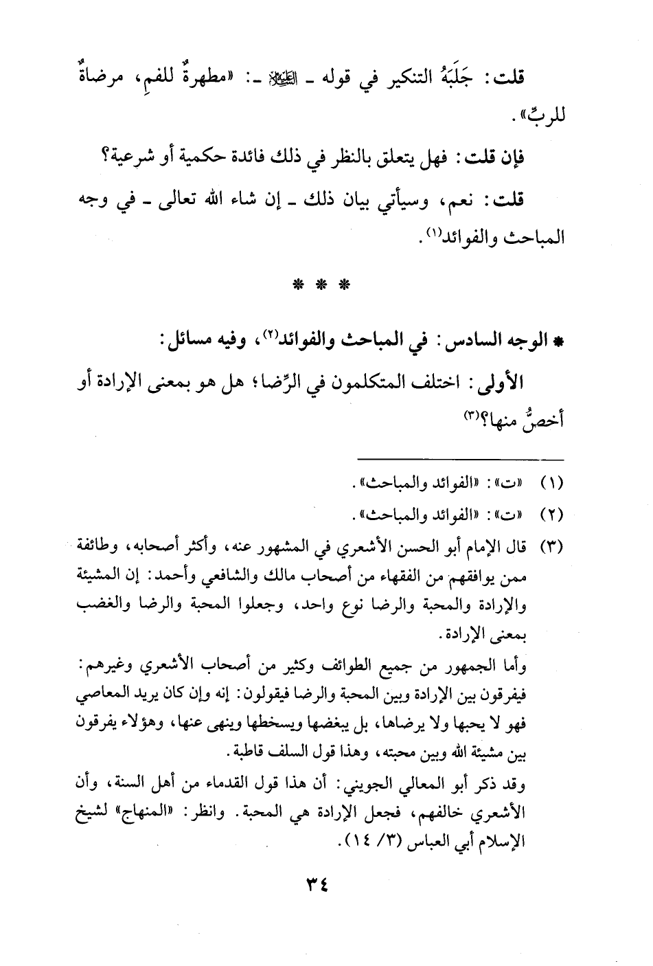 (¬3) قال الإمام أبو الحسن الأشعري في المشهور عنه، وأكثر أصحابه، وطائفة ممن يوافقهم من الفقهاء من أصحاب مالك والشافعي وأحمد: إن المشيئة والإرادة والمحبة والرضا نوع واحد، وجعلوا المحبة والرضا والغضب بمعنى الإرادة.