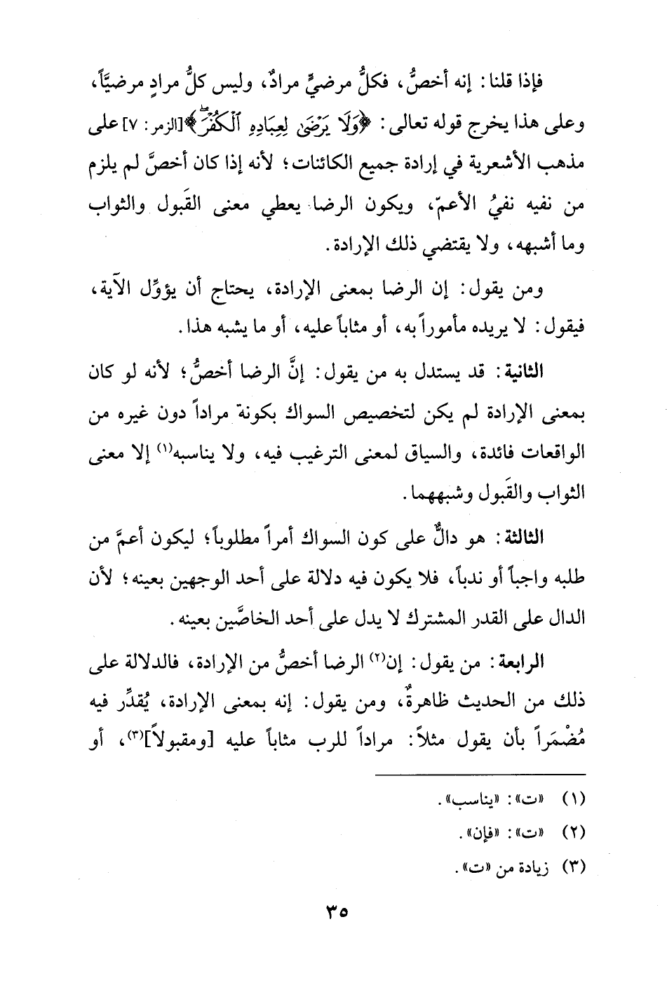 فإذا قلنا: إنه أخصُّ، فكلُّ مرضيٍّ مرادٌ، وليس كلُّ مرادٍ مرضيًّا، وعلى هذا يخرج قوله تعالى: {وَلَا يَرْضَى لِعِبَادِهِ الْكُفْرَ} [الزمر: 7] على مذهب الأشعرية في إرادة جميع الكائنات؛ لأنه إذا كان أخصَّ لم يلزم من نفيه نفيُ الأعم، ويكون الرضا يعطي معنى القَبول والثواب وما أشبهه، ولا يقتضي ذلك الإرادة.