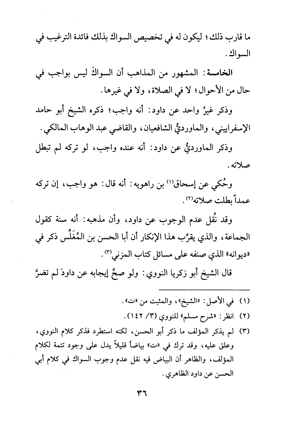 (¬3) لم يذكر المؤلف ما ذكر أبو الحسن، لكنه استطرد فذكر كلام النووي، وعلق عليه، وقد ترك في "ت" بياضًا قليلًا يدل على وجود تتمة لكلام المؤلف، والظاهر أن البياض فيه نقل عدم وجوب السواك في كلام أبي الحسن عن داود الظاهري.