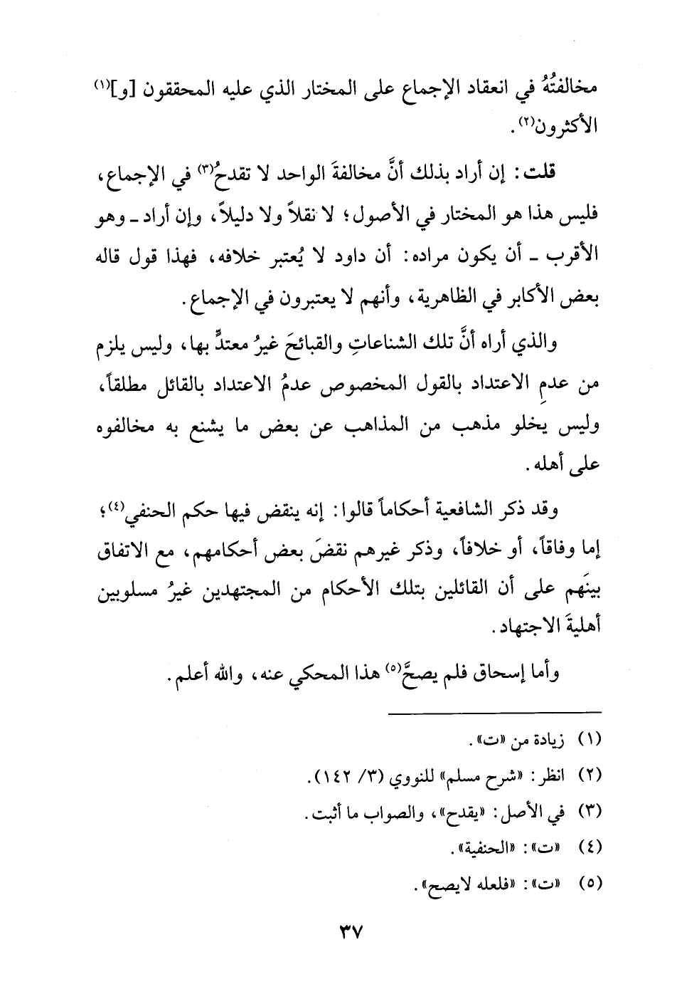 قلت: إن أراد بذلك أنَّ مخالفةَ الواحد لا تقدحُ (¬3) في الإجماع، فليس هذا هو المختار في الأصول؛ لا نقلًا ولا دليلًا، وإن أراد - وهو الأقرب - أن يكون مراده: أن داود لا يُعتبر خلافه، فهذا قول قاله بعض الاكابر في الظاهرية، وأنهم لا يعتبرون في الإجماع.