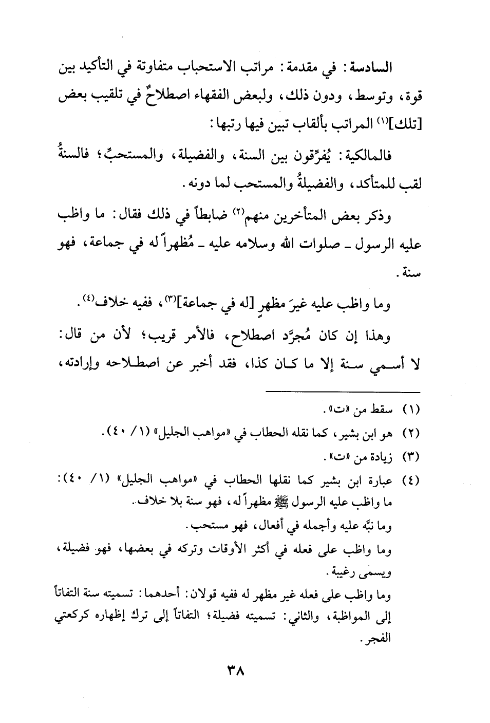(¬4) عبارة ابن بشير كما نقلها الحطاب في "مواهب الجليل" (1/ 40): ما واظب عليه الرسول - صلى الله عليه وسلم - مظهرًا له، فهو سنة بلا خلاف.