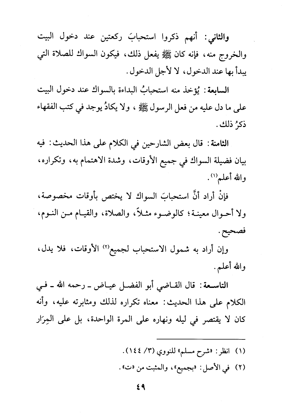 التاسعة: قال القاضي أبو الفضل عياض - رحمه الله - في الكلام على هذا الحديث: معناه تكراره لذلك ومثابرته عليه، وأنه كان لا يقتصر في ليله ونهاره على المرة الواحدة، بل على المِرَار