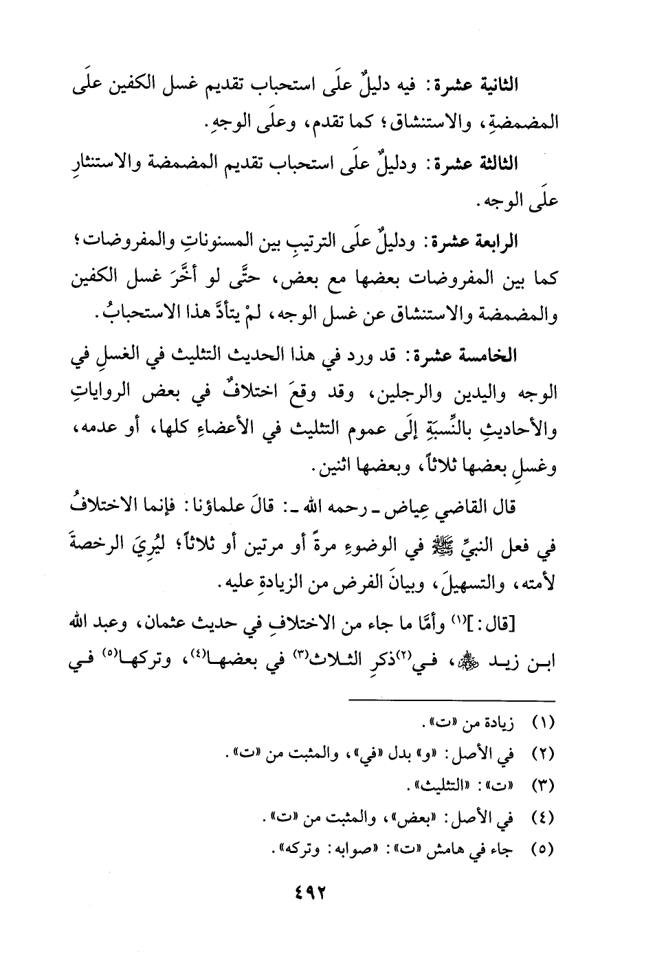 الخامسة عشرة: قد ورد في هذا الحديث التثليث في الغسلِ في الوجه واليدين والرجلين، وقد وقعَ اختلافٌ في بعض الرواياتِ والأحاديثِ بالنِّسبَةِ إلَى عموم التثليث في الأعضاءِ كلها، أو عدمه، وغسلِ بعضها ثلاثًا، وبعضها اثنين.