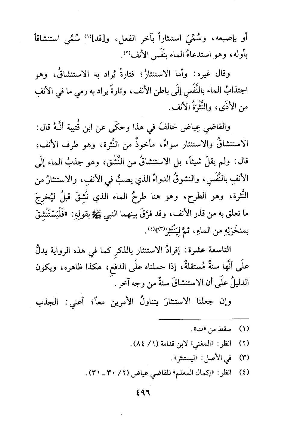 والقاضي عِياض خالفَ في هذا وحكَى عن ابن قُتيبة أنَّهُ قال: الاستنشاقُ والاستنثار سواء، مأخوذٌ من النَّثرة، وهو طرف الأنف، قال: ولم يقلْ شيئاً، بل الاستنشاقُ من النَّشْق، وهو جذبُ الماء إلَى الأنفِ بالنَّفَسِ، والنشوقُ الدواءُ الذي يصبُّ في الأنفِ، والاستنثارُ من النَّثرة، وهو الطرح، وهو هنا طرحُ الماء الذي نشُقَ قبلُ ليُخرِجَ ما تعلق به من قذر الأنف، وقد فرَّقَ بينهما النبي - صلى الله عليه وسلم - بقولهِ: "فَلْيَسْتَنْشِقْ بمنخَرَيْهِ من الماءِ، ثمَّ لِيَنْتَثِرْ (¬3) " (¬4).