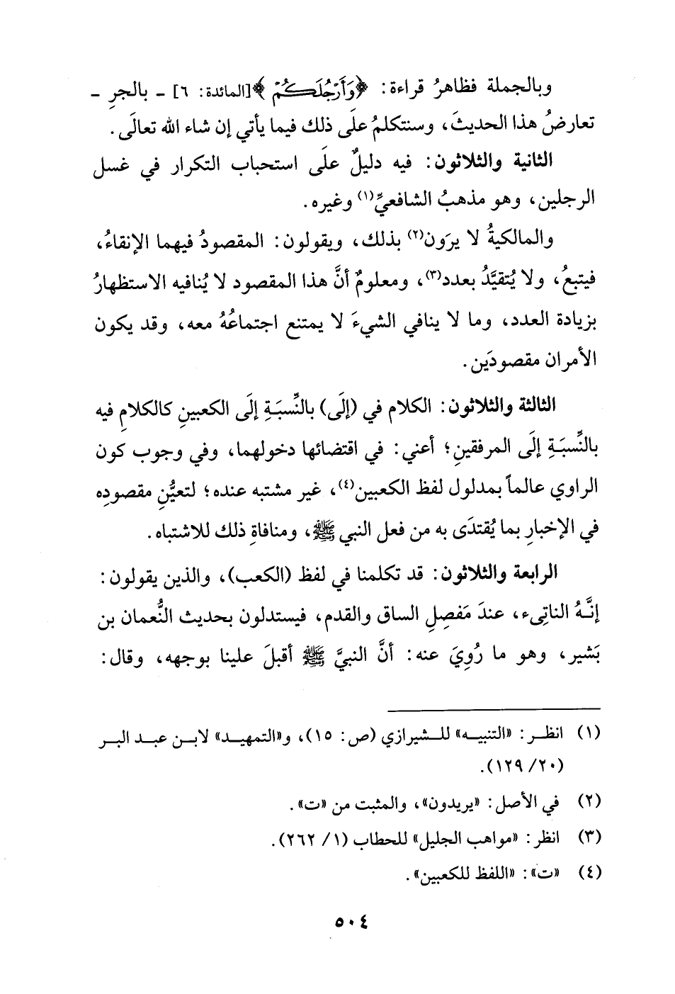 الرابعة والثلاثون: قد تكلمنا في لفظ (الكعب)، والذين يقولون: إنَّهُ الناتِئ، عندَ مَفصِلِ الساق والقدم، فيستدلون بحديث النُّعمان بن بَشير، وهو ما رُوِيَ عنه: أنَّ النبيَّ - صلى الله عليه وسلم - أقبلَ علينا بوجهه، وقال: