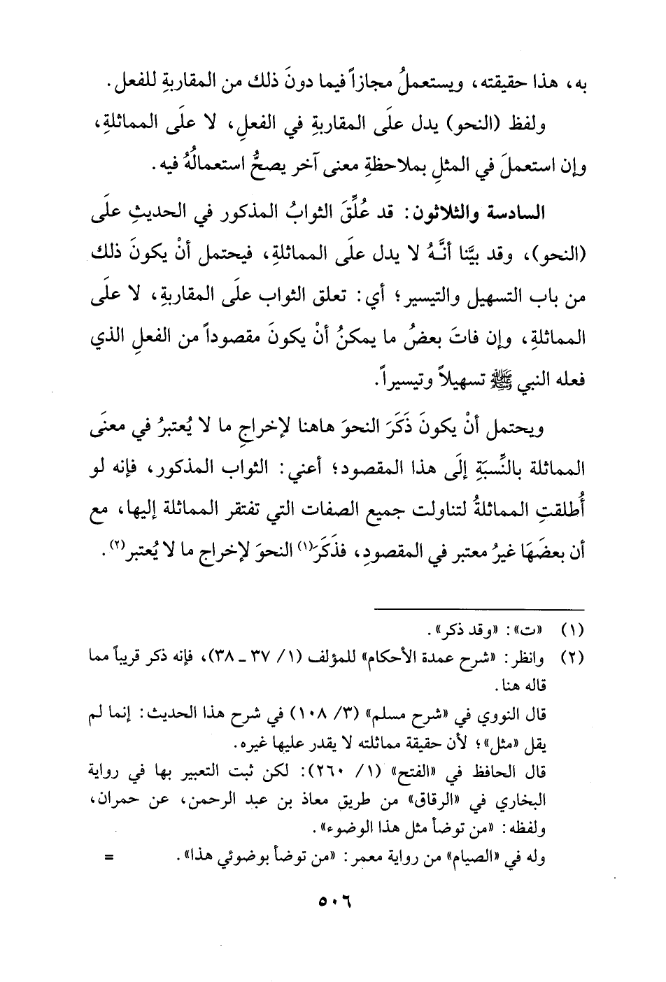 ولفظ (النحو) يدل علَى المقاربةِ في الفعلِ، لا علَى المماثلةِ، وإن استعملَ في المثلِ بملاحظةِ معنى آخر يصحُّ استعمالُهُ فيه.