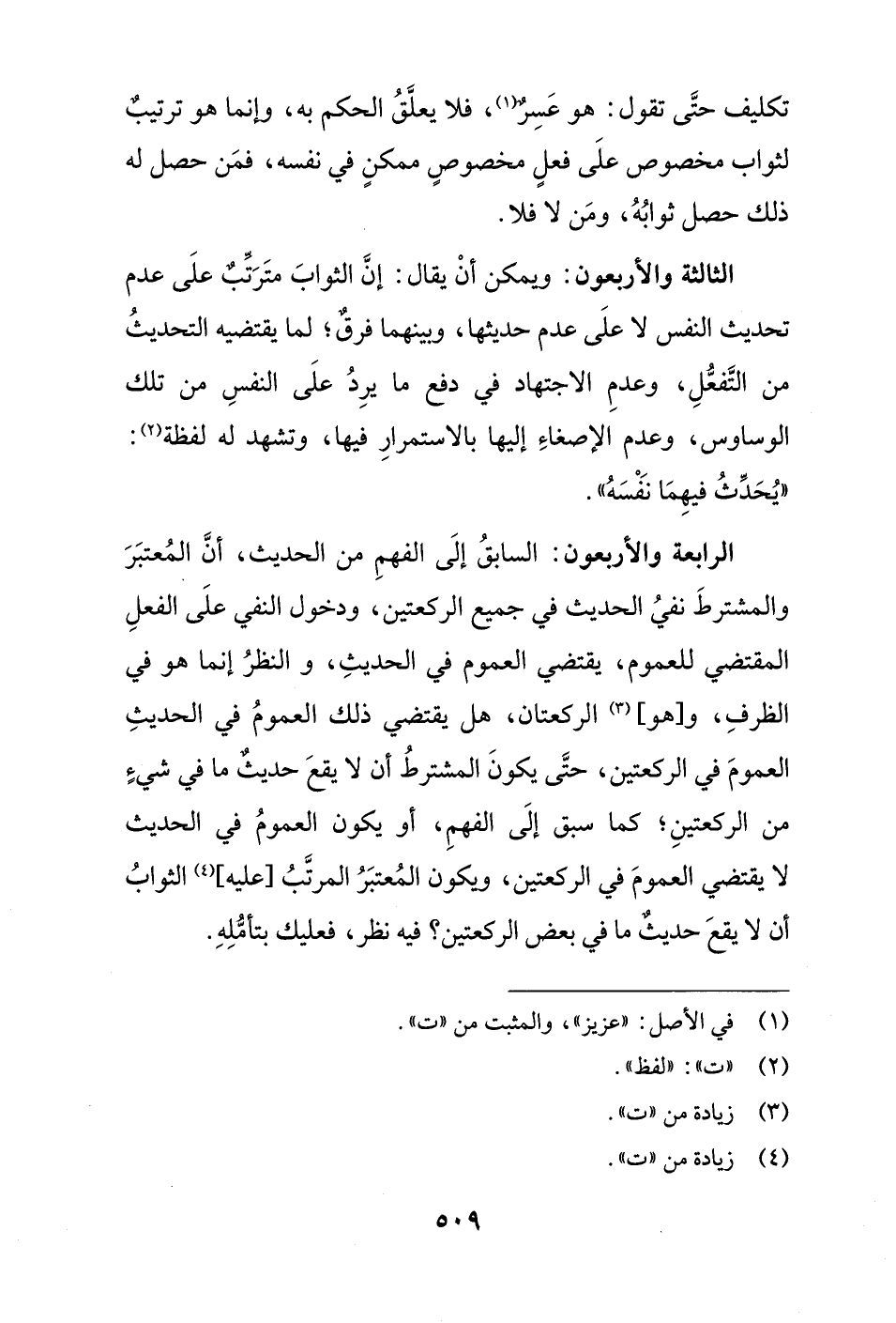 الرابعة والأربعون: السابقُ إلَى الفهمِ من الحديث، أنَّ المُعتبَرَ والمشترطَ نفيُ الحديث في جميع الركعتين، ودخول النفي علَى الفعلِ المقتضي للعموم، يقتضي العموم في الحديثِ، والنظرُ إنما هو في الظرفِ، و [هو] (¬3) الركعتان، هل يقتضي ذلك العمومُ في الحديثِ العمومَ في الركعتين، حتَّى يكونَ المشترطُ أن لا يقعَ حديثٌ ما في شيءٍ من الركعتينِ؛ كما سبق إلَى الفهمِ، أو يكون العمومُ في الحديث لا يقتضي العمومَ في الركعتين، ويكون المُعتبَرُ المرتَّبُ [عليه] (¬4) الثوابُ أن لا يقعَ حديثٌ ما في بعض الركعتين؟ فيه نظر، فعليك بتأمّلِهِ.