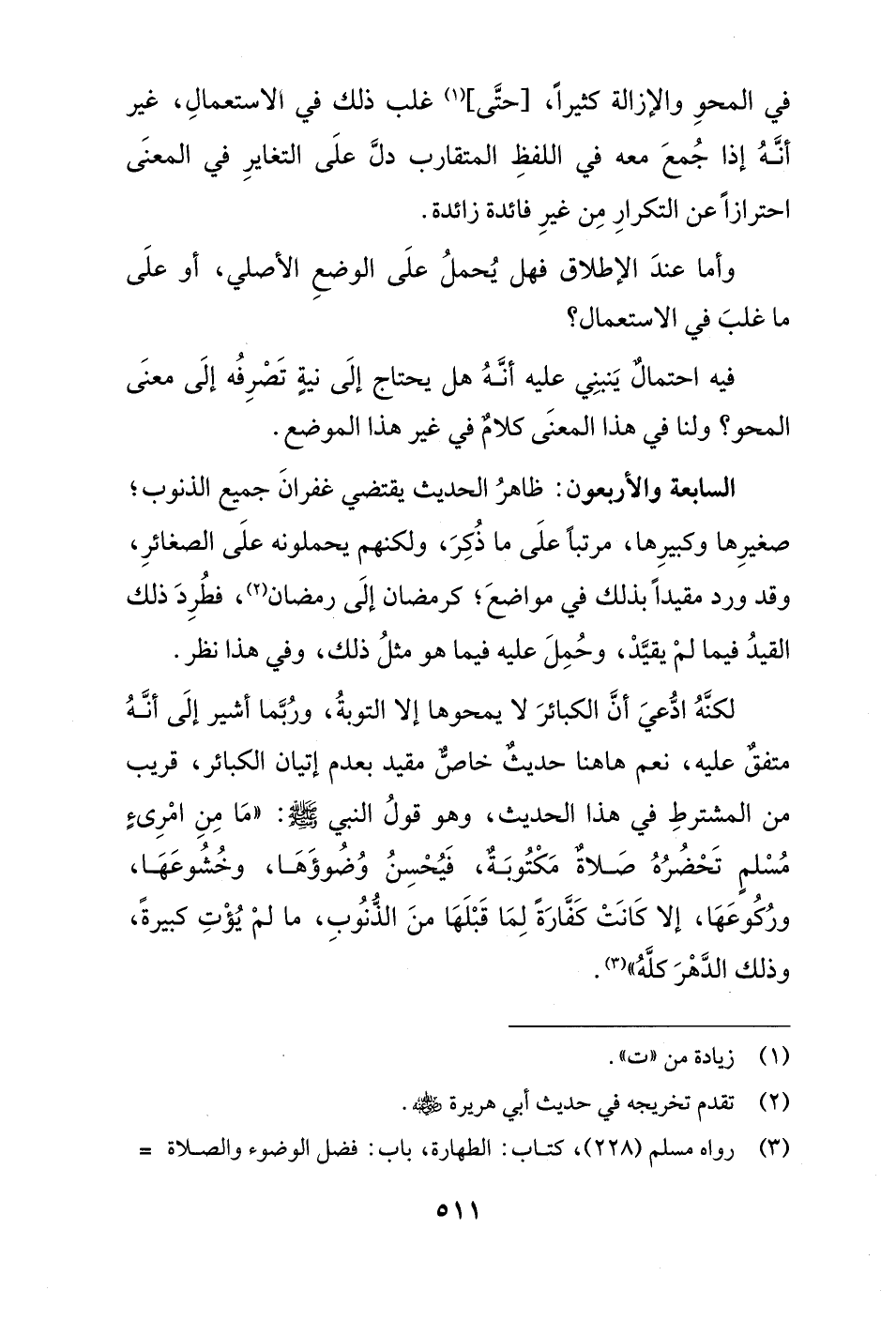 لكنَّهُ ادُّعيَ أنَّ الكبائرَ لا يمحوها إلا التوبةُ، ورُبَّما أشير إلَى أنَّهُ متفقٌ عليه، نعم هاهنا حديثٌ خاصٌّ مقيد بعدم إتيان الكبائر، قريب من المشترطِ في هذا الحديث، وهو قولُ النبي - صلى الله عليه وسلم -: "مَا مِنِ امْرِئٍ مُسْلمٍ تَحْضُرُهُ صَلاةٌ مَكْتُوبَةٌ، فَيُحْسِنُ وُضُوؤَهَا، وخُشُوعَهَا، ورُكُوعَهَا، إلا كَانَتْ كَفَّارَةً لِمَا قَبْلَهَا منَ الذُّنُوبِ، ما لمْ يُؤْتِ كبيرةً، وذلك الدَّهْرَ كلَّهُ" (¬3).
