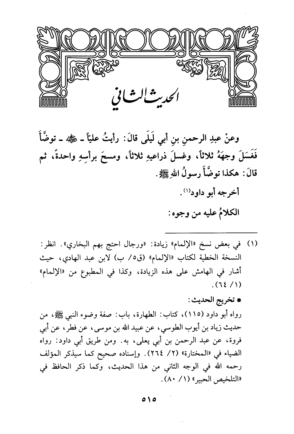 وعنْ عبدِ الرحمنِ بنِ أبي لَيلَى قالَ: رأيتُ عليًّا - رضي الله عنه - توضَّأَ فَغَسَلَ وجهَهُ ثلاثًا، وغسلَ ذراعيهِ ثلاثًا، ومسحَ برأسِهِ واحدةً، ثم قالَ: هكذا توضَّأَ رسولُ اللهِ - صلى الله عليه وسلم -.