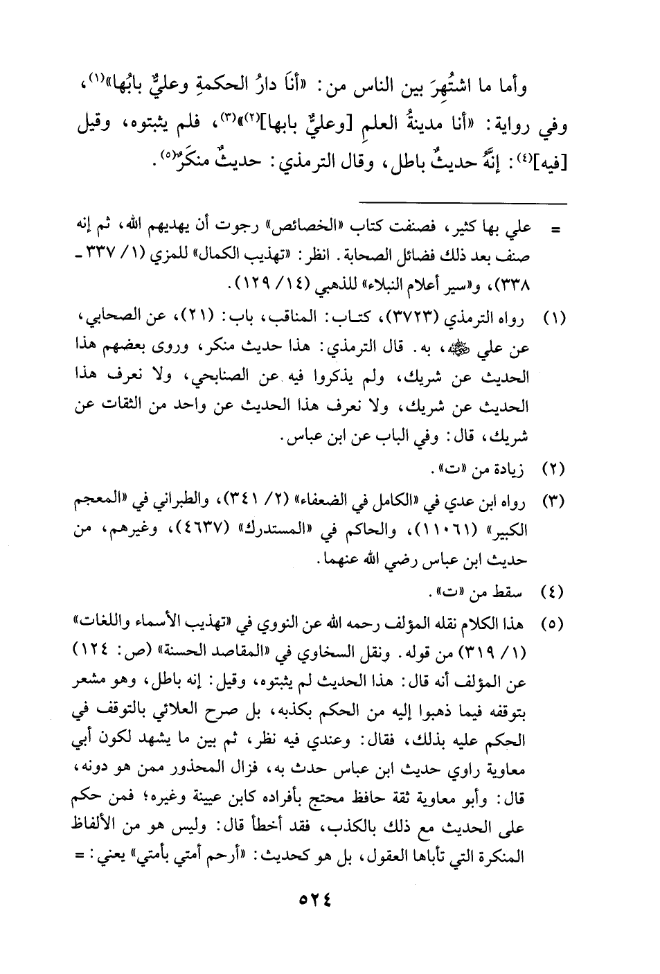 وأما ما اشتُهِرَ بين الناس من: "أنَا دارُ الحكمةِ وعليٌّ بابُها" (¬1)، روفي رواية: "أنا مدينةُ العلمِ [وعليٌّ بابها] (¬2) " (¬3)، فلم يثبتوه، وقيل [فيه] (¬4): إنَّهُ حديثٌ باطل، وقال الترمذي: حديثٌ منكَرٌ (¬5).