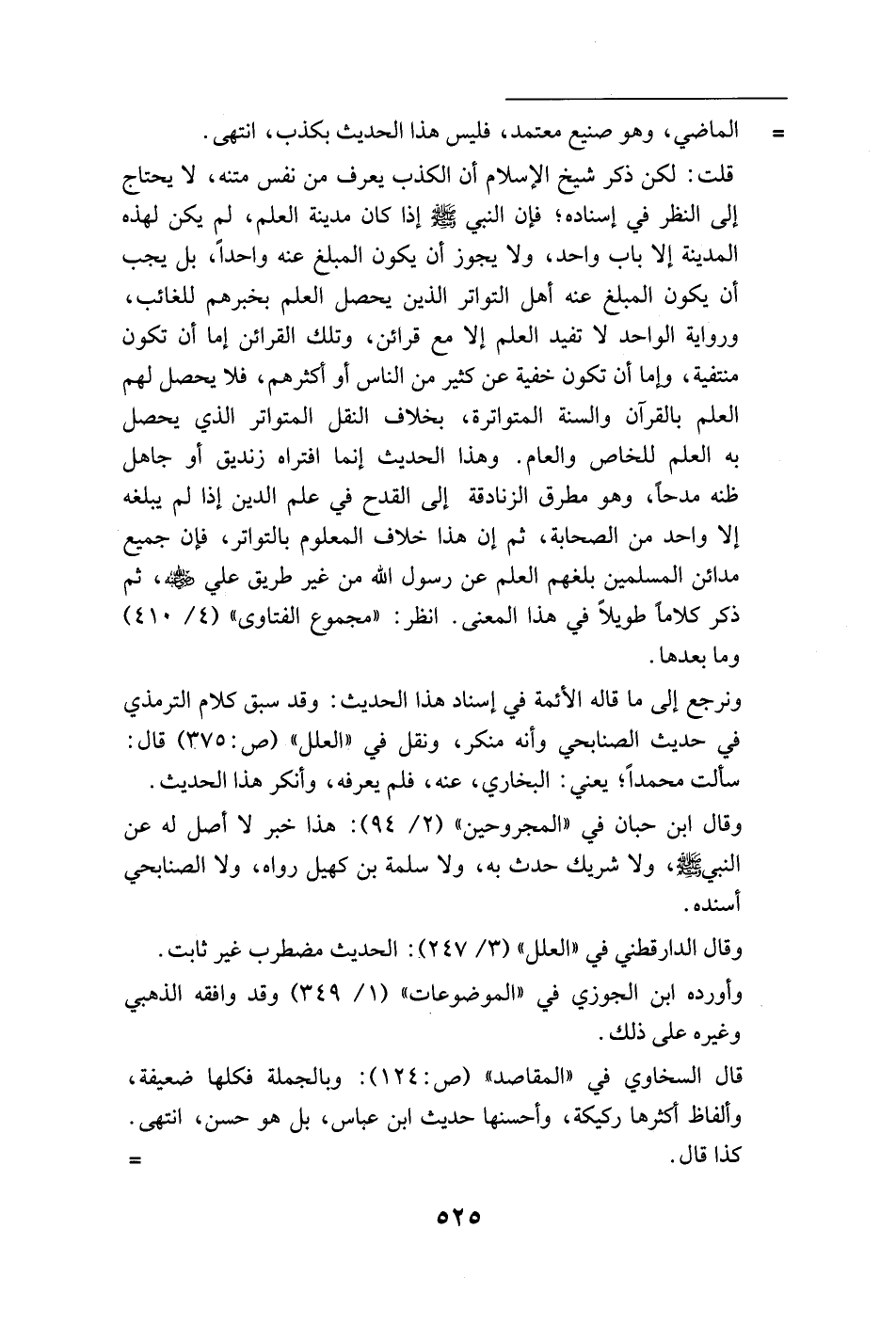 قلت: لكن ذكر شيخ الإسلام أن الكذب يعرف من نفس متنه، لا يحتاج إلى النظر في إسناده؛ فإن النبي - صلى الله عليه وسلم - إذا كان مدينة العلم، لم يكن لهذه المدينة إلا باب واحد، ولا يجوز أن يكون المبلغ عنه واحدًا، بل يجب أن يكون المبلغ عنه أهل المتواتر الذين يحصل العلم بخبرهم للغائب، ورواية الواحد لا تفيد العلم إلا مع قرائن، وتلك القرائن إما أن تكون منتفية، وإما أن تكون خفية عن كثير من الناس أو أكثرهم، فلا يحصل لهم العلم بالقرآن والسنة المتواترة، بخلاف النقل المتواتر الذي يحصل به العلم للخاص والعام. وهذا الحديث إنما افتراه زنديق أو جاهل ظنه مدحًا، وهو مطرق الزنادقة إلى القدح في علم الدين إذا لم يبلغه إلا واحد من الصحابة، ثم إن هذا خلاف المعلوم بالتواتر، فإن جميع مدائن المسلمين بلغهم العلم عن رسول الله من غير طريق - رضي الله عنه - ,ثم ذكر كلامًا طويلًا في هذا المعنى. انظر: "مجموع الفتاوى" (4/ 410) وما بعدها.