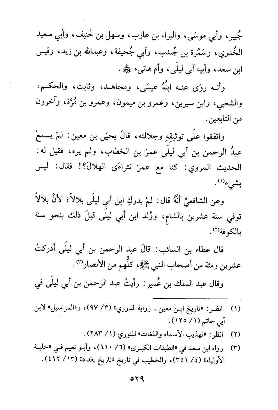 واتفقوا علَى توثيقِهِ وجلالته، قالَ يحيَى بن معين: لمْ يسمعْ عبدُ الرحمن بن أبي ليلَى عمرَ بن الخطاب، ولم يره، فقيل له: الحديث المروي: كنا مع عمرَ نتراءَى الهلالَ؟! فقال: ليس بشيء (¬1).